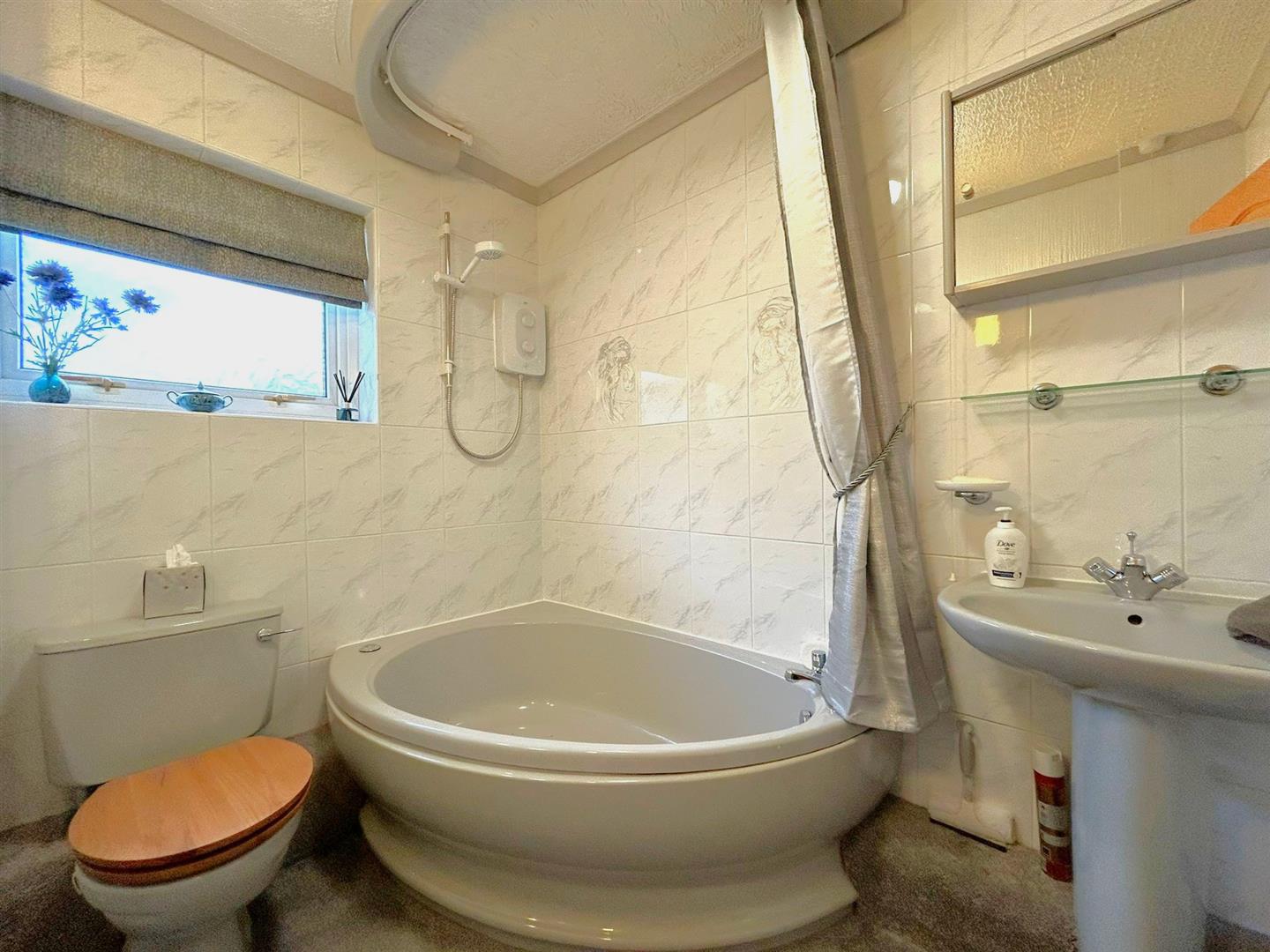 Grey three piece bathroom suite comprising: low level w.c, pedestal wash hand basin and corner bath with Mira electric shower, fitted carpet, frosted double glazed window, mirrored vanity cupboard, tiled walls and radiator.