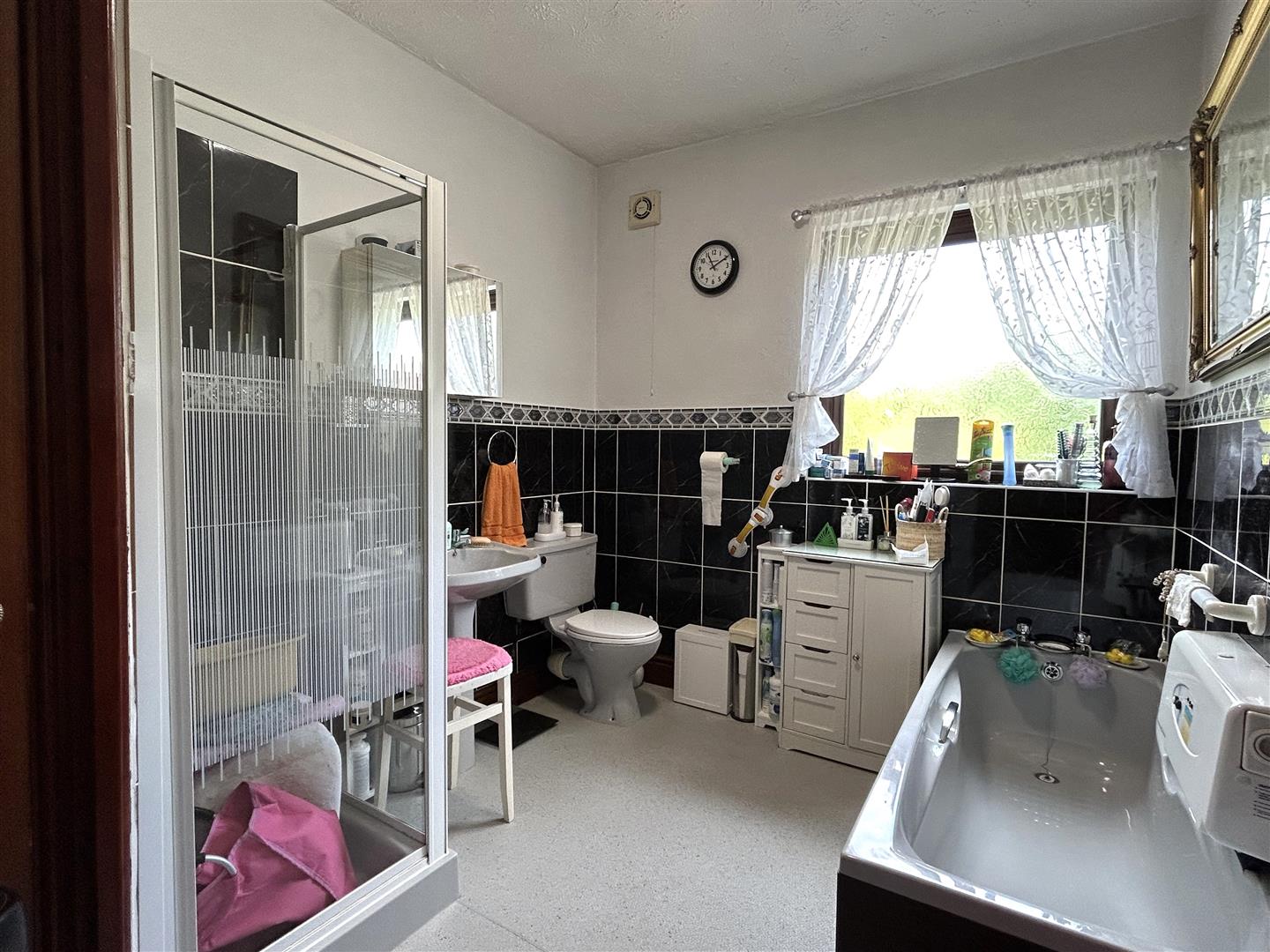 Fitted with a four piece suite comprising of a wash hand basin, panelled bath, shower cubicle with mains shower, part tiled walls, non slip flooring, airing cupboard and frosted double glazed window.