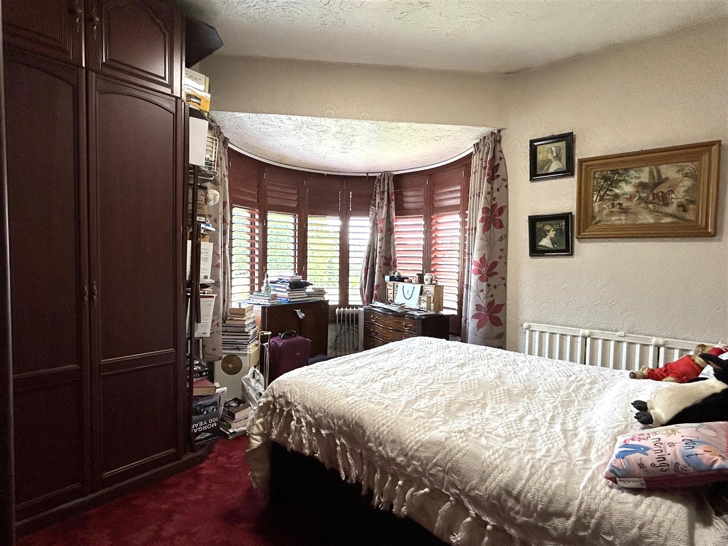 Front aspect double bedroom with circular bay window, blind shutters, fitted wardrobes, radiator and fitted carpet.