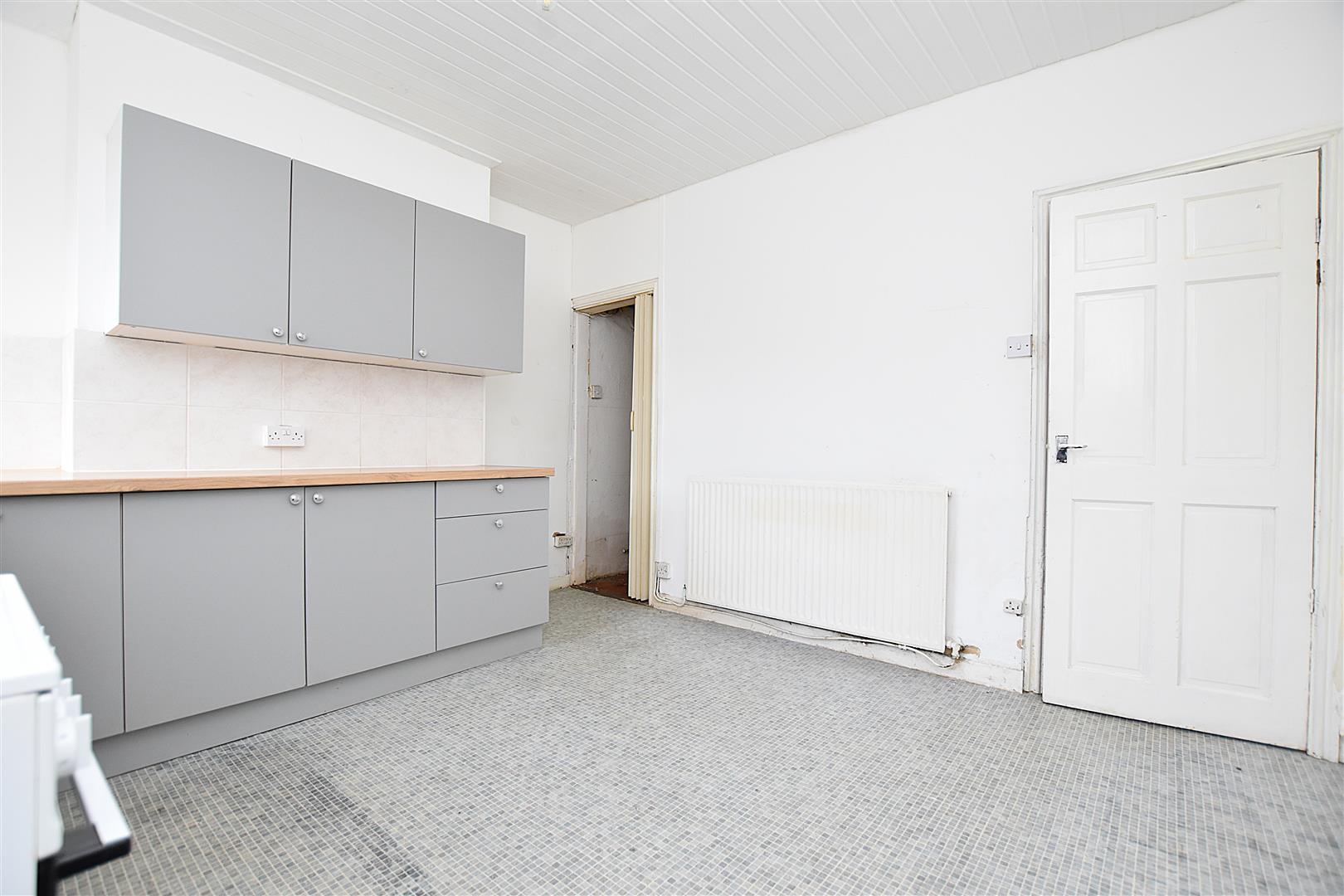 Appointed with a modern grey fronted range of base and wall cupboards complimented by wood effect work surface areas incorporating a stainless steel single drainer sink unit with mixer tap, part tiled walls, radiator, upvc double glazed window, understairs storage cupboard, free standing cooker and six panel white woodgrain effect door opening to:
