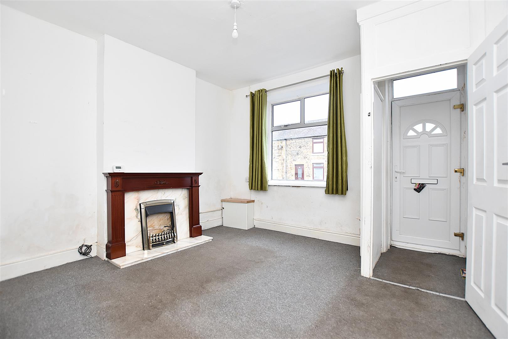 Upvc double glazed window to front, radiator, fireplace and six panel white woodgrain effect door opening to: