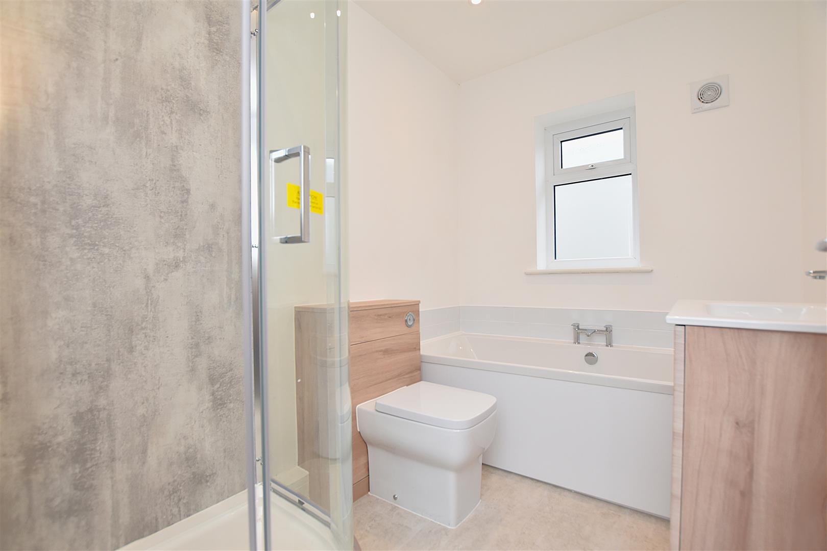 Newly appointed with a four piece white bathroom suite of corner shower enclosure with mains thermostatic shower, Drench style shower head and wipe clean wall panels, bath with central mixer tap, wash basin set within vanity unit, low flush w.c, part tiled walls, designer heated towel rail, toothbrush holder/charger, upvc double glazed window, inset ceiling spotlights and extractor fan.
