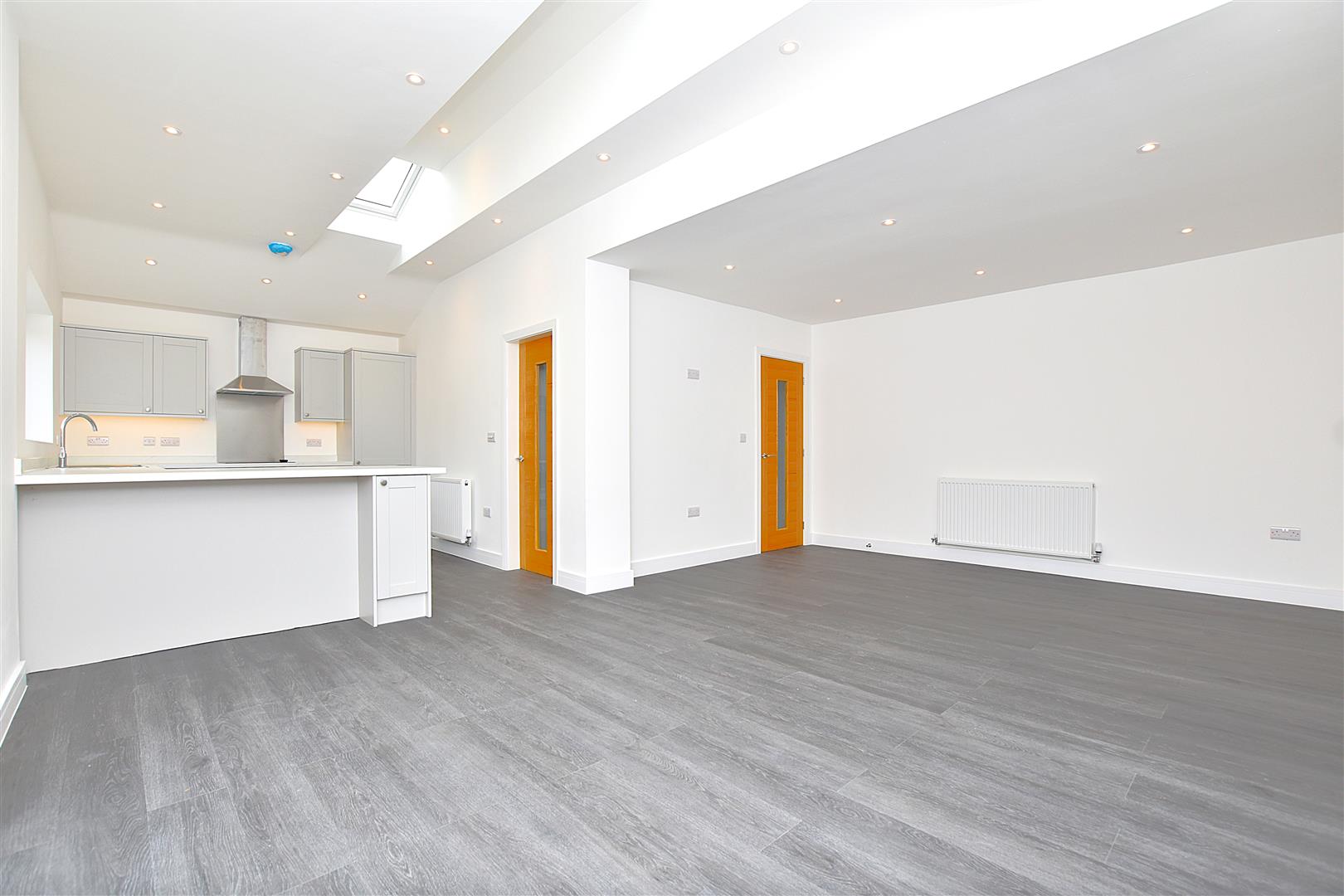 An impressive light and airy hub of the home with grey wood effect laminate flooring throughout and inset ceiling spotlights, upvc double glazed French doors lead into the rear garden, two radiators and two Velux roof light windows to partial raised ceiling. The kitchen/breakfast area is fitted with a range of light grey shaker style base and wall cupboards complimented by work surface areas with matching upstands incorporating stainless steel 1 1/2 bowl sink unit with mixer tap and upvc double glazed window above overlooking the rear garden, four ring electric hob with oven/grill below and stainless steel splashback and extractor hood above, integrated dishwasher, integrated fridge freezer, integrated washing machine and radiator.