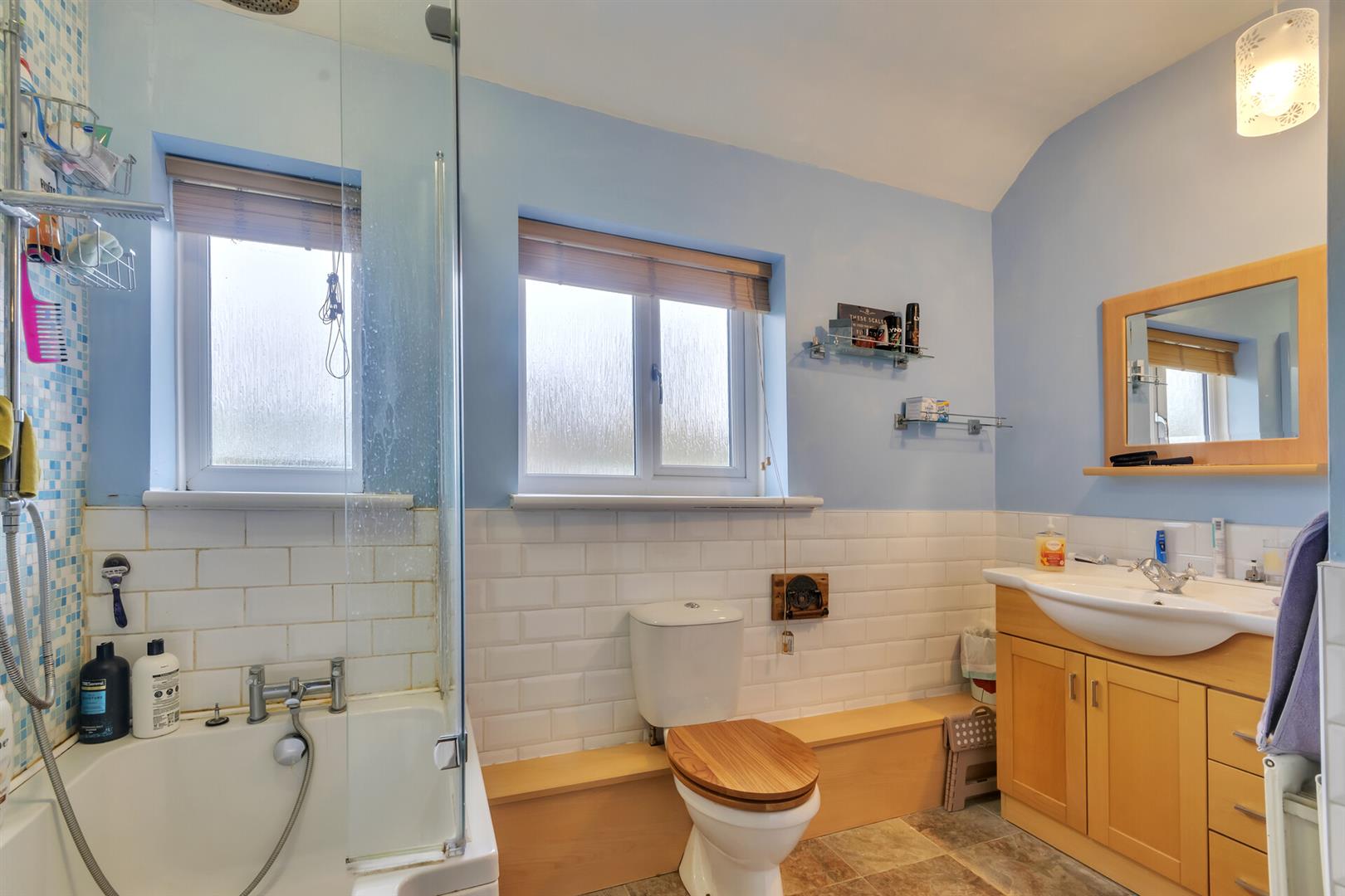 Bath with mains shower over and side screen, WC, wash hand basin in vanity unit, part tiled walls, feature glass brickwork above doorway, two UPVC double glazed windows, tiled floor and airing cupboard housing the Worcester gas "combination" boiler.