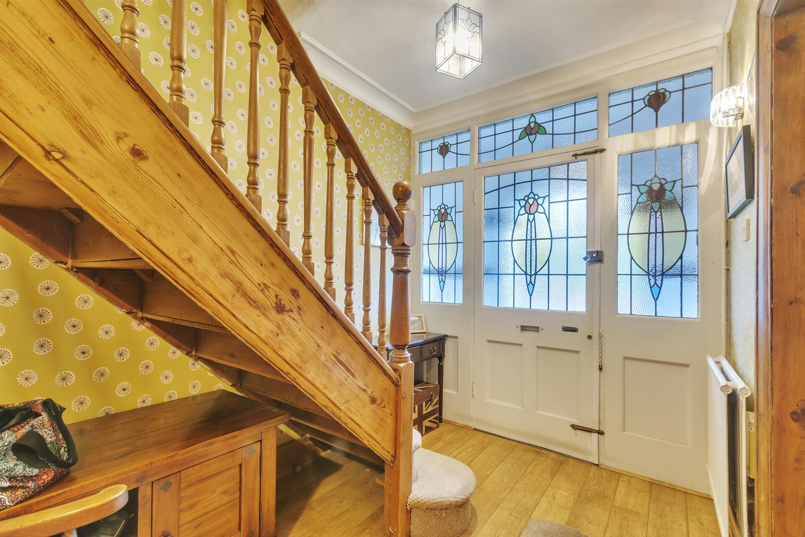A stripped pitch pine staircase with spindled balustrade is completed by the stained, tall skirting boards and door frames, wood effect laminate flooring, double radiator, useful understairs store area, coved ceiling, two wall light points and three panel doors.