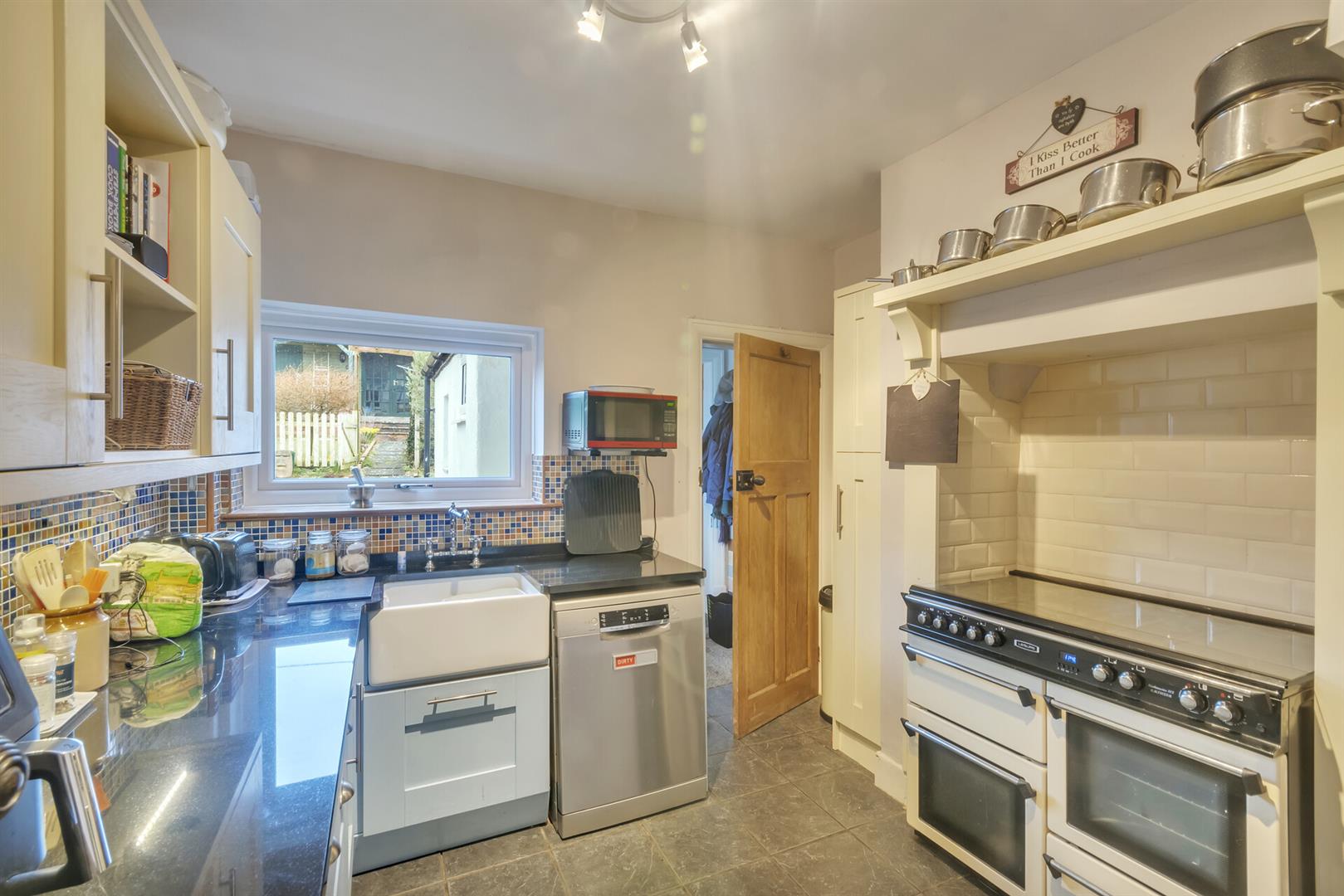 Fitted with a charming cottage-style range of two-tone bespoke base and wall cabinets, complemented by black granite worktops and matching upstands. An integrated drainer sits alongside a traditional Belfast sink with a Victorian-style mixer tap, positioned beneath a UPVC double-glazed window overlooking the rear garden. A “Leisure Cookmaster” range-style cooker with a five-burner gas hob, hot plate, double oven and separate grill sits neatly within the former chimney breast, creating an attractive focal point. Additional features include part-tiled walls, space for a fridge freezer, and a tiled floor.