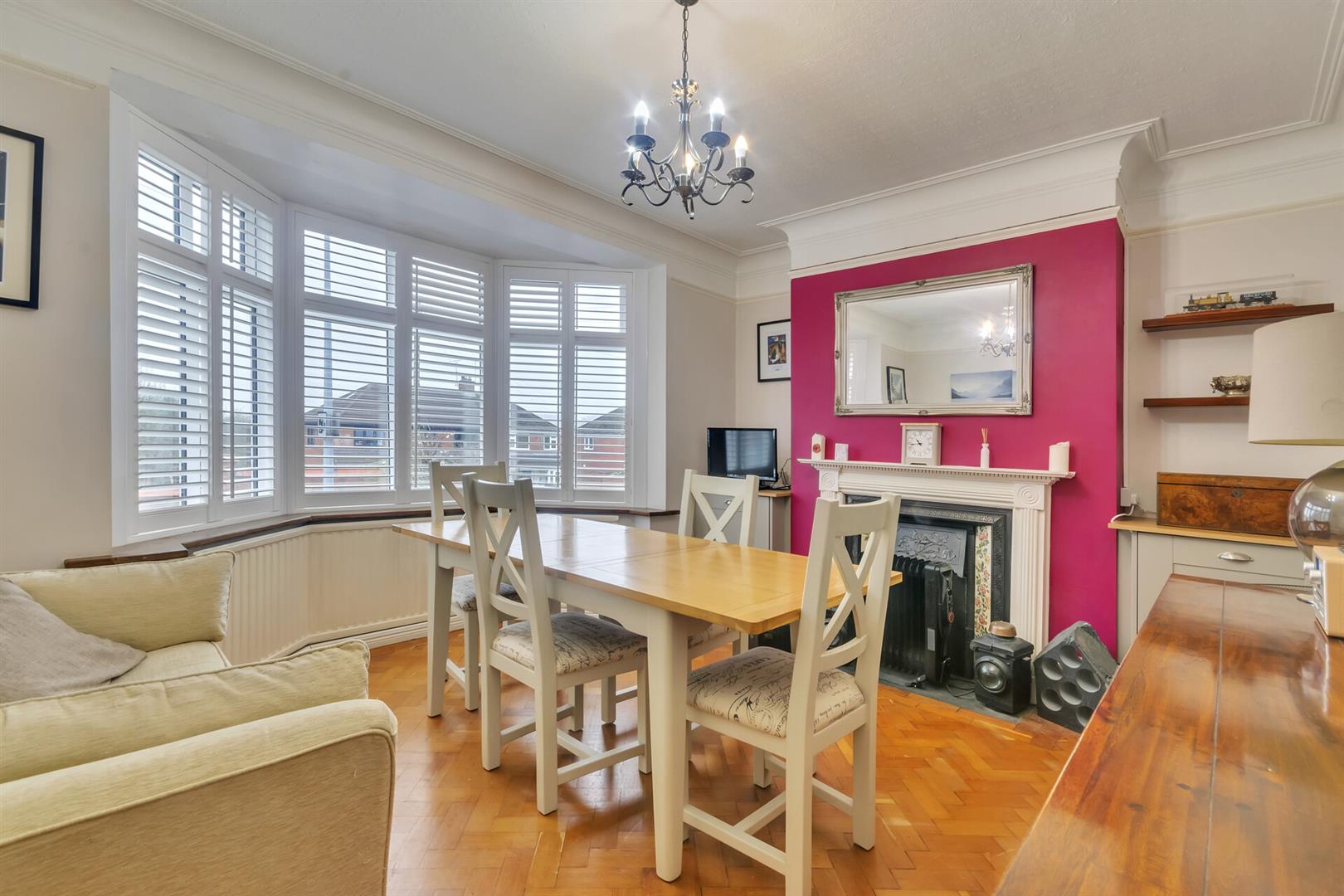 Enjoying an excellent degree of natural light from a UPVC double-glazed bay window with fitted shutters and a radiator beneath, this room features an exposed herringbone-patterned solid wood floor, coving to the ceiling, and a picture rail. A charming pine fire surround with a cast iron and decorative tiled insert sits on a slate hearth, creating an attractive focal point.