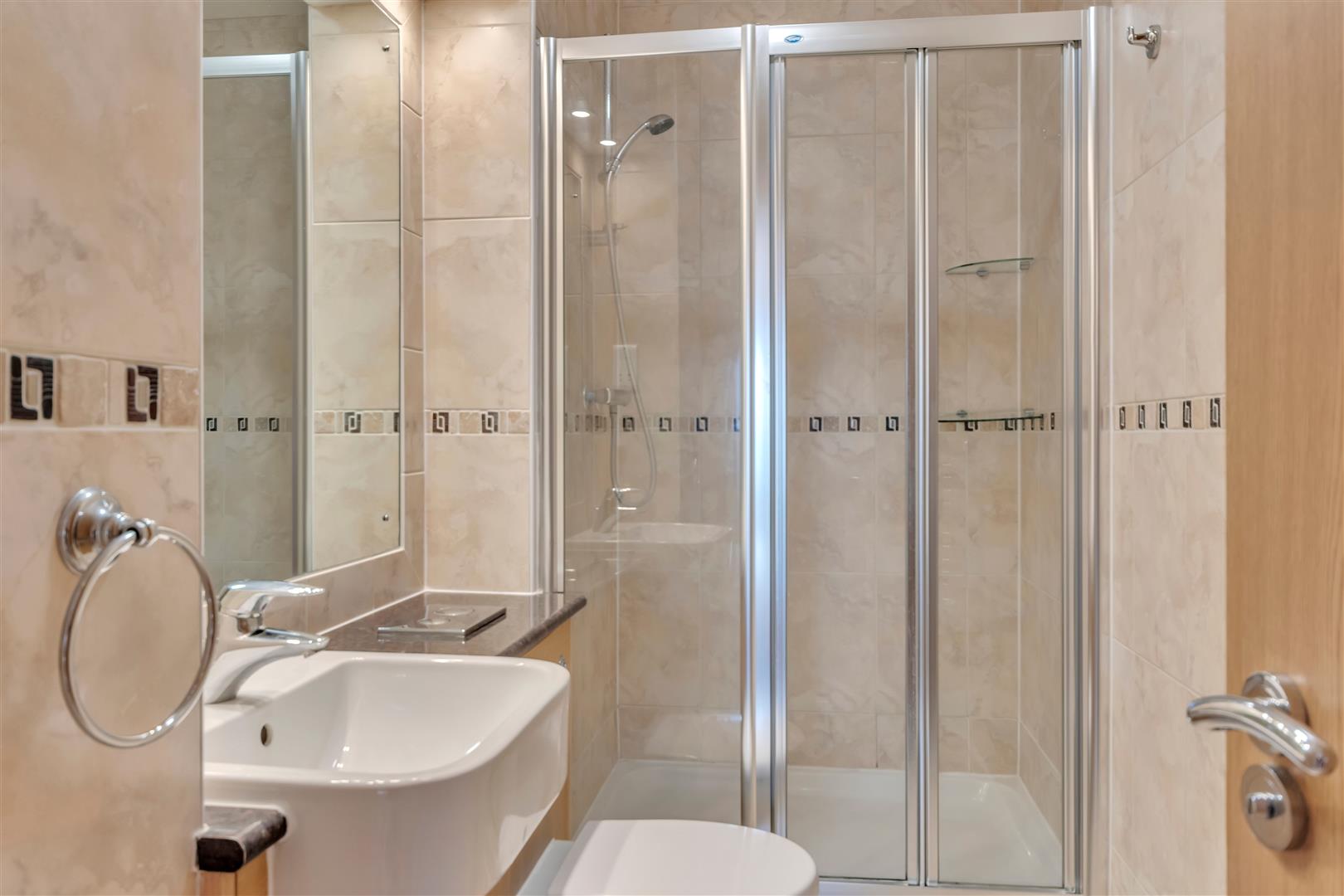 Appointed with shower enclosure having mains shower, low level w.c and wash hand basin set within vanity unit with mirror and spotlights above, chrome heated towel rail, extractor, part tiled walls.