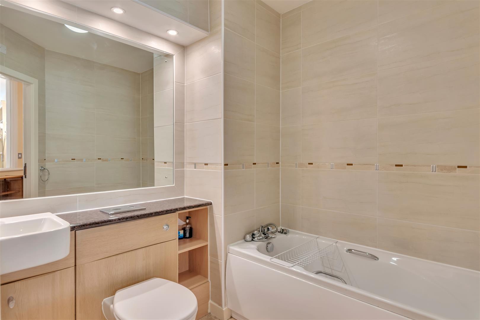A three piece suite of bath with mixer tap, low flush w.c and wash hand basin set within vanity unit with mirror and spotlights above, part tiled walls, chrome heated towel rail.
