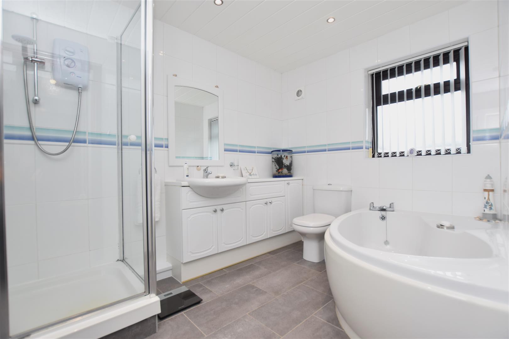 A good sized family bathroom appointed with a four piece white suite of corner bath with mixer tap, shower enclosure with electric shower, wash basin set within vanity unit, low flush w.c, upvc double glazed window, fully tiled walls, tiled flooring, inset ceiling spotlights, radiator and extractor fan.