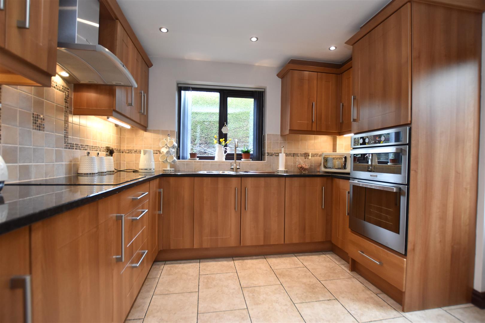 Fitted with a shaker style range of base and wall cupboards complimented by granite work surface areas incorporating an AEG induction hob with Neff stainless steel extractor hood above, Hotpoint double oven/grill, integrated fridge, circular sink with matching drainer and upvc double glazed window above, under unit lighting, radiator, tiled flooring, inset ceiling lighting and upvc part glazed external door.