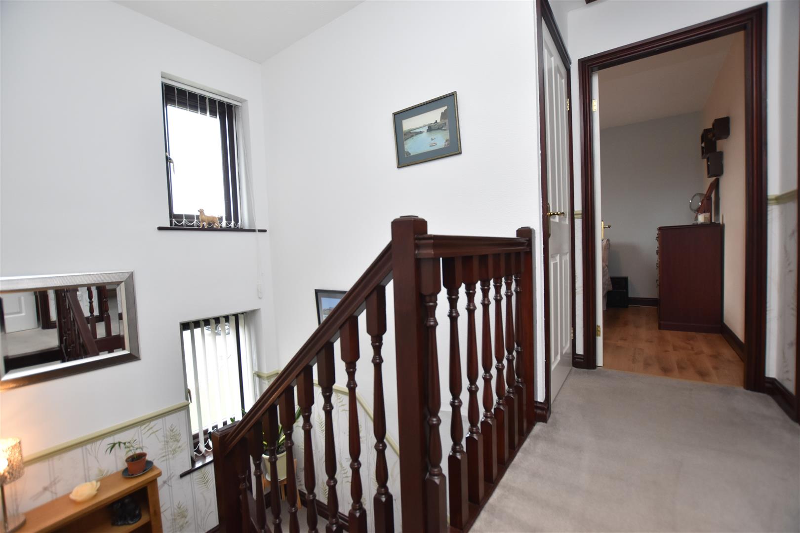 With gallery over stairwell, ceiling hatch to roof space with partially boarded loft area, dado rail, four panel white woodgrain effect doors off and airing cupboard housing the hot water cylinder with slatted shelving.