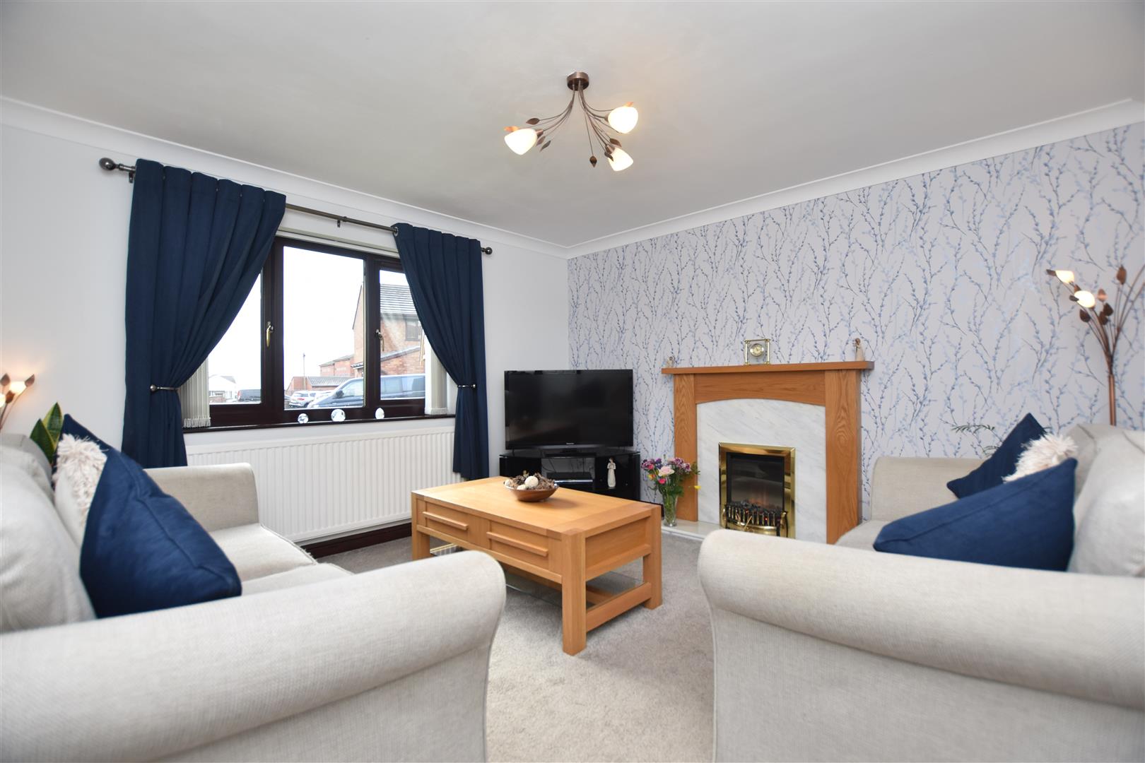 Upvc double glazed window to front with radiator below, electric fire in oak veneer surround with marble hearth, coving to ceiling, television aerial point and four panel white woodgrain effect door opening to: