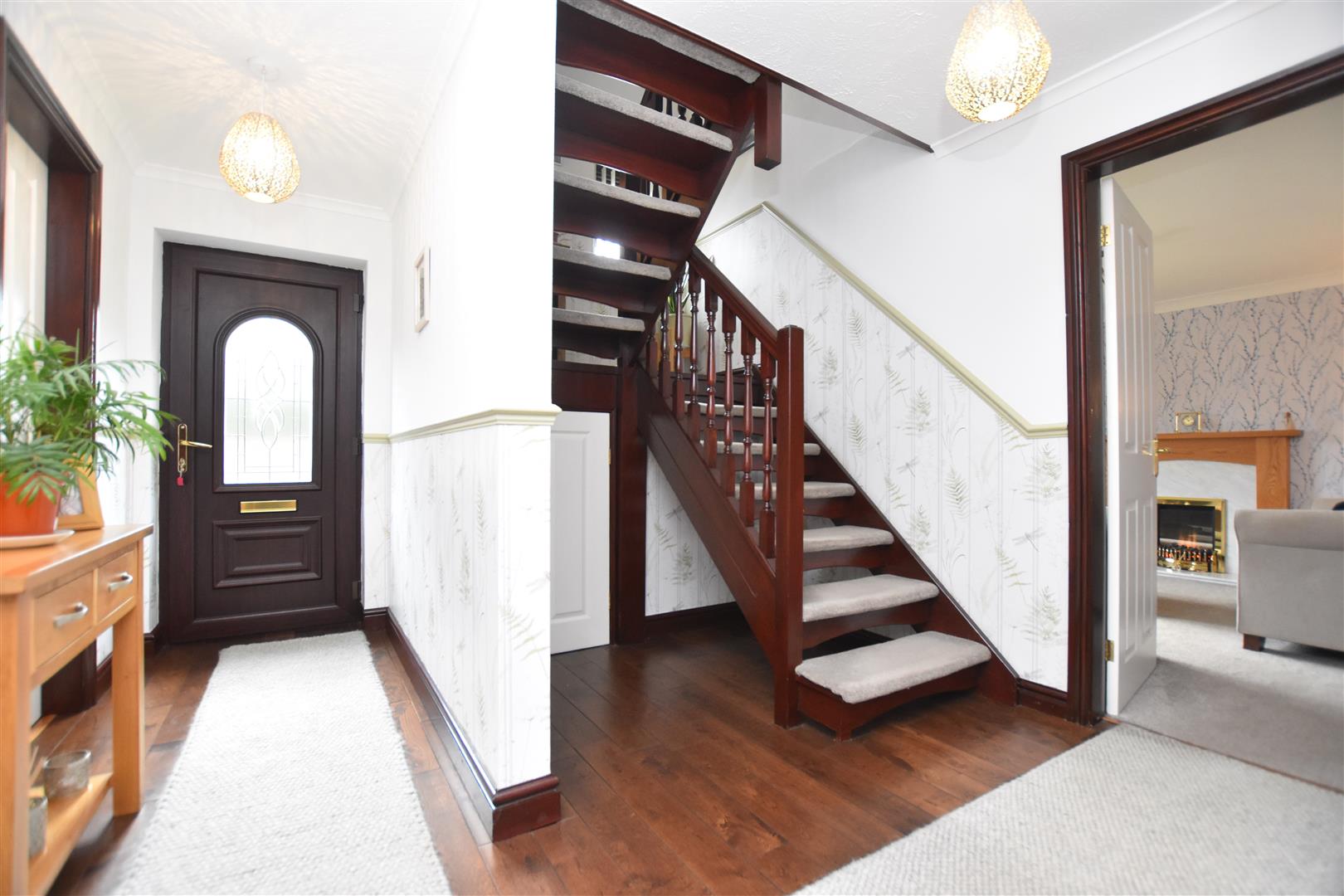 Featuring wood flooring, turned staircase with useful storage cupboard below, two upvc double glazed windows providing an excellent degree of natural light, coving to ceiling, dado rail, radiator, Hive central heating controls, four panel white woodgrain effect doors off to all rooms and useful storage cupboard having the benefit of plumbing for washing machine with work surface above, Baxi gas central heating boiler and ceiling light.