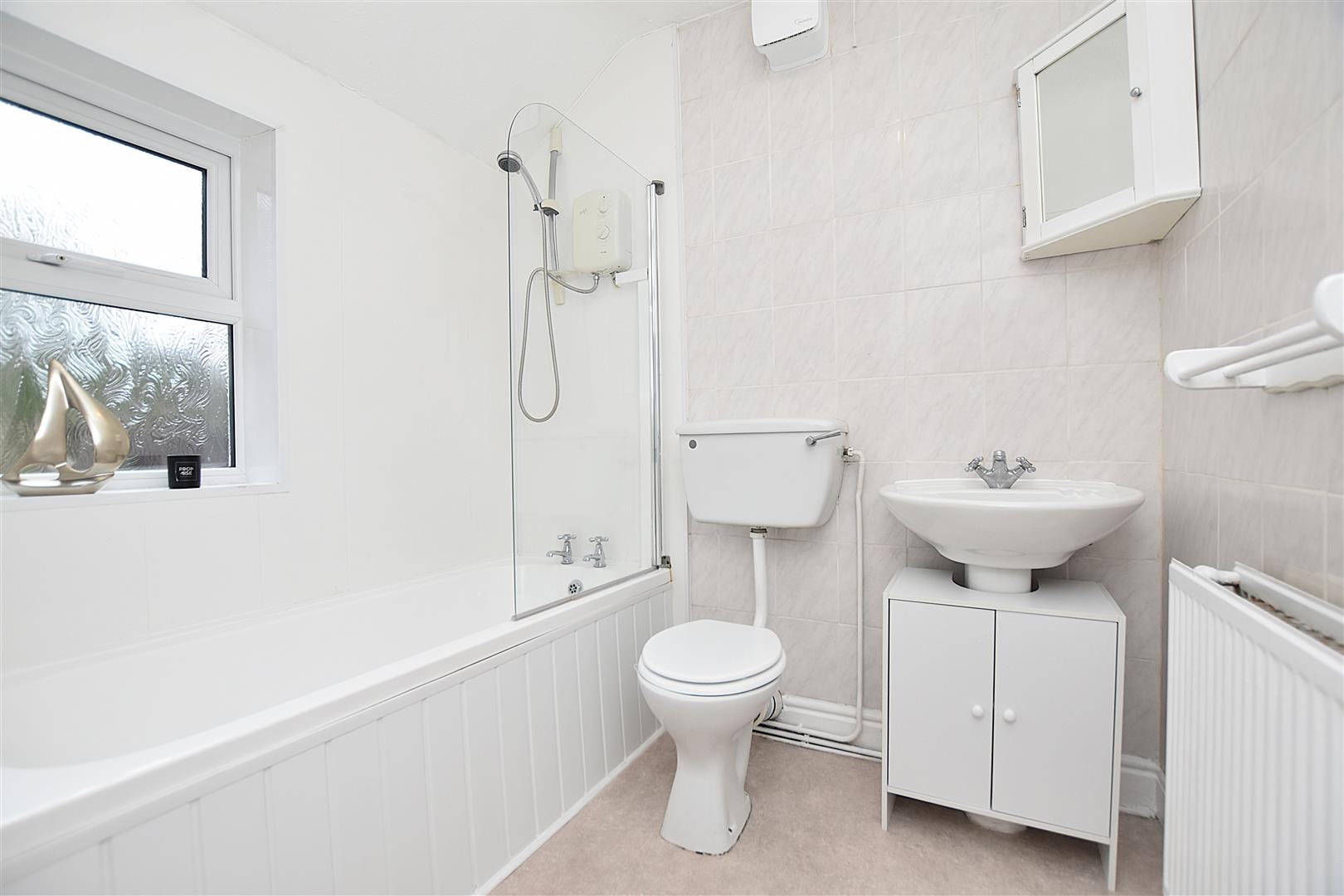 Appointed with a white suite of low flush w.c, pedestal wash basin with mixer tap, bath with electric shower over and wipe clean wall panels, upvc double glazed window, radiator, splash screen, part tiled walls, extractor fan and two door storage cupboard.