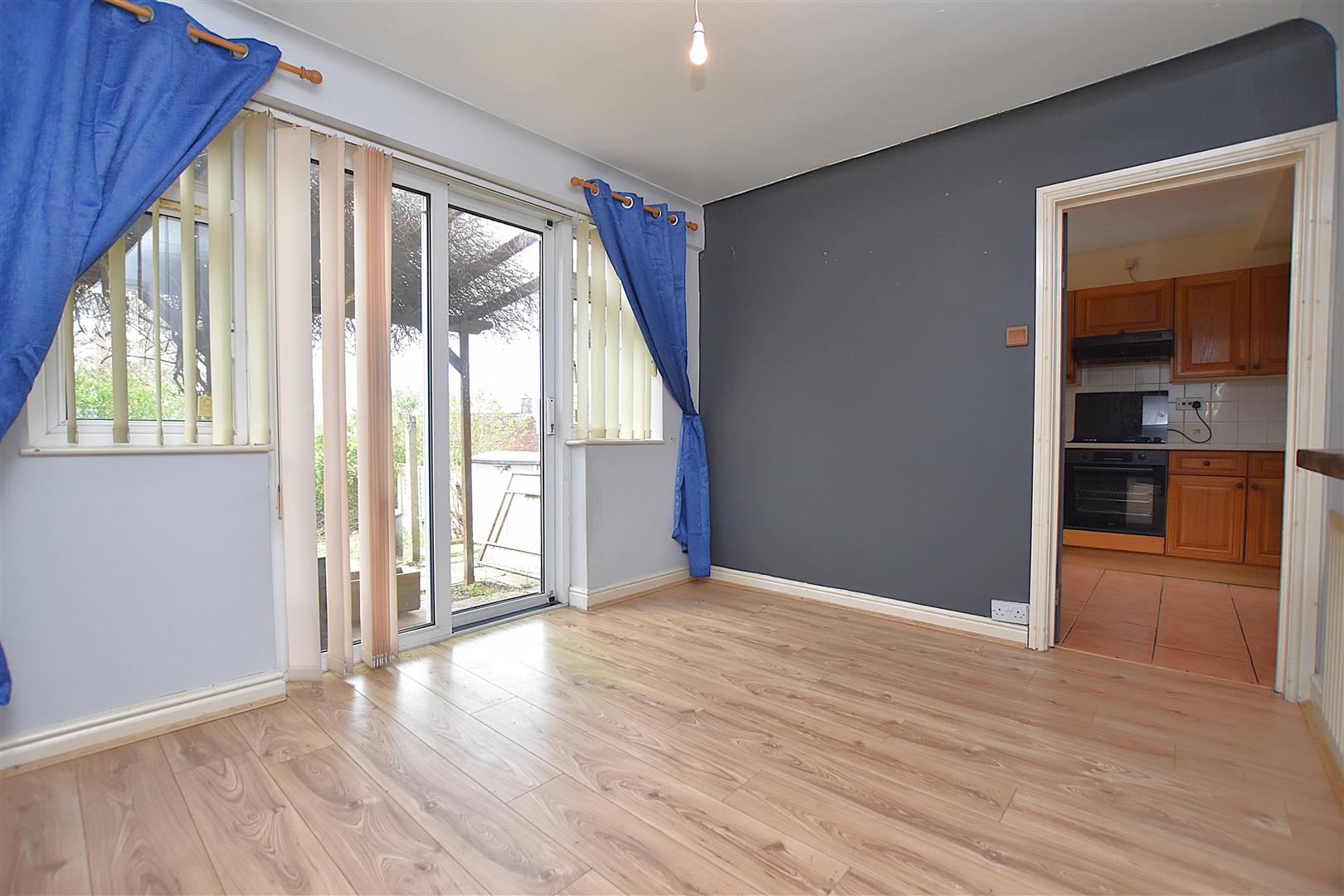 Wood effect laminate flooring, two upvc double glazed windows, radiator, double glazed sliding patio doors and part glazed door opening to: