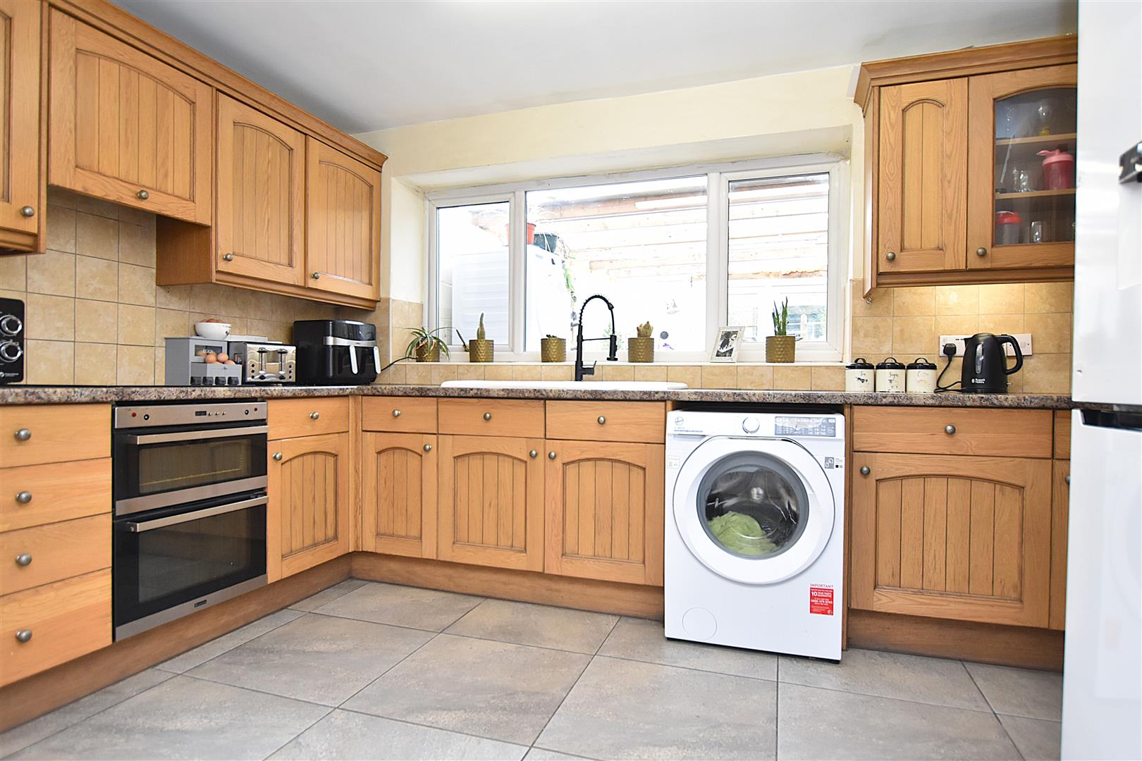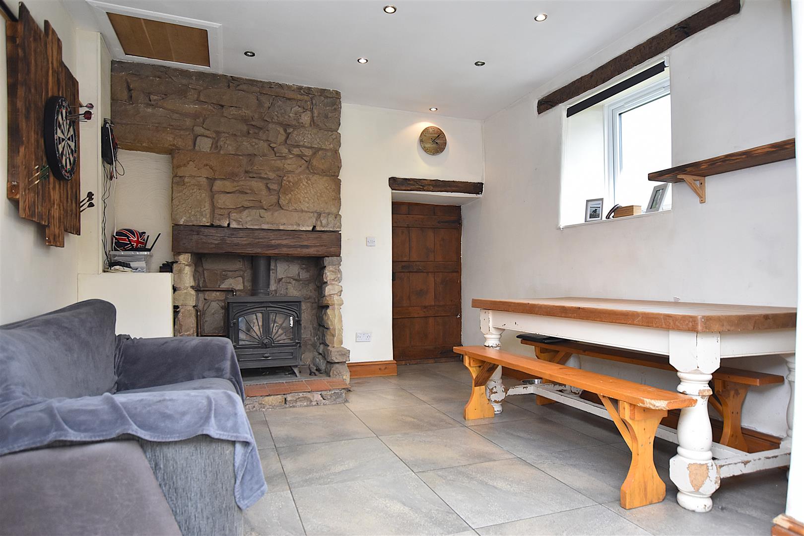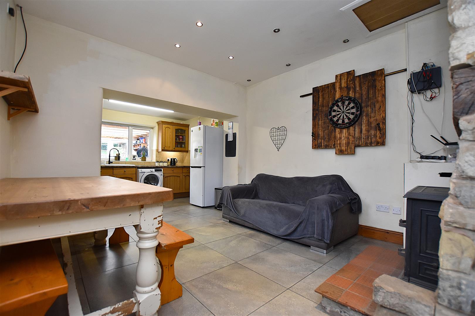 Offering excellent entertaining and family space with the dining area having the warmth of a log burner within stone chimney breast, timber mantel and tiled hearth, inset ceiling spotlights and Upvc double glazed window to side. The kitchen area is appointed with a range of base and wall cupboards complimented by work surface areas incorporating a 4 ring electric hob with extractor hood above, double oven/grill, plumbing for washing machine, tiled splashback, 1 1/2 bowl ceramic sink unit with flexi mixer tap and Upvc double glazed window above, tiled floor and connecting door to the inner hall.