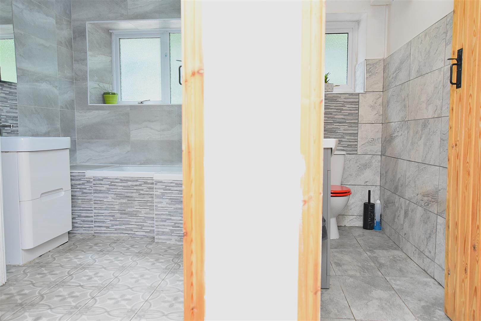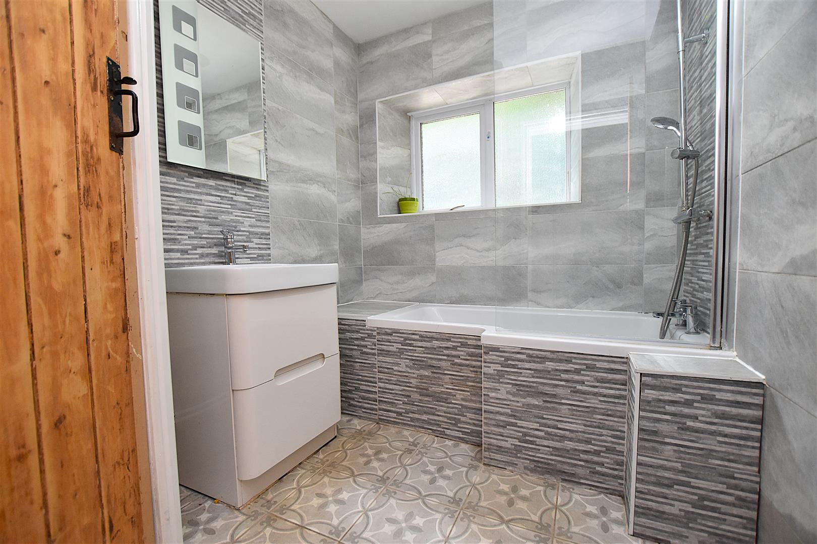 Appointed with a white suite of P shaped bath with mains thermostatic shower and drench style shower head, splash screen, wash basin within vanity unit, chrome heated towel rail, fully tiled walls, illuminated mirror, Upvc double glazed window and store cupboard.