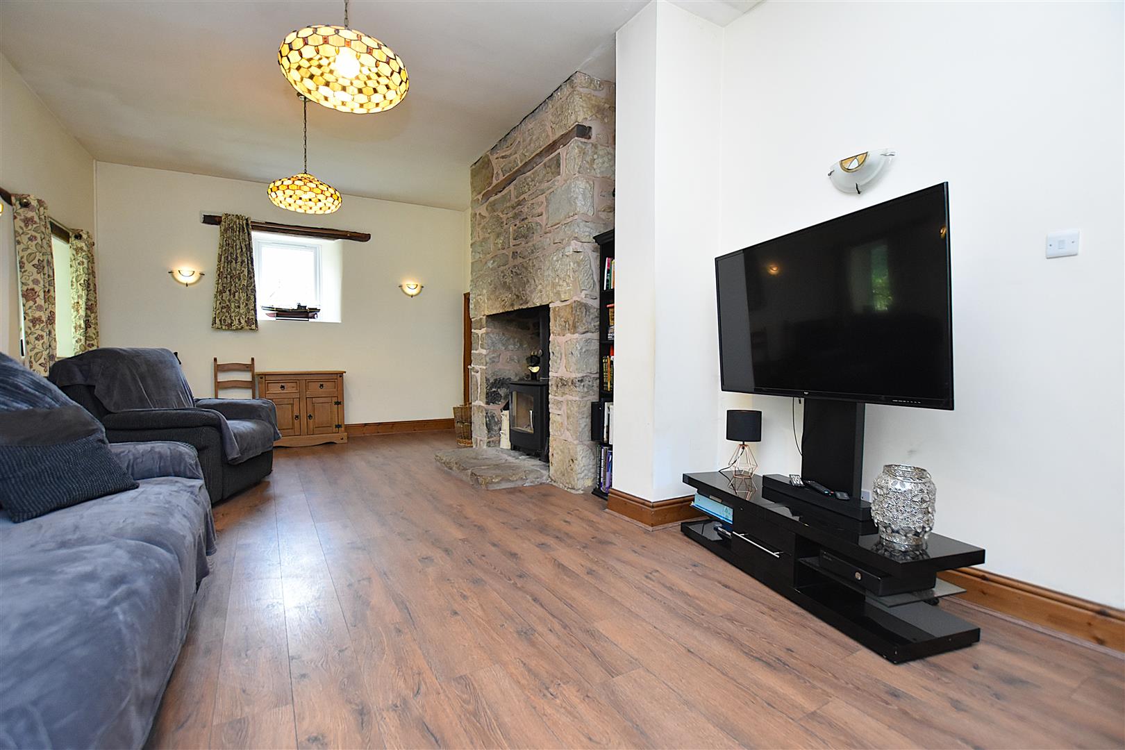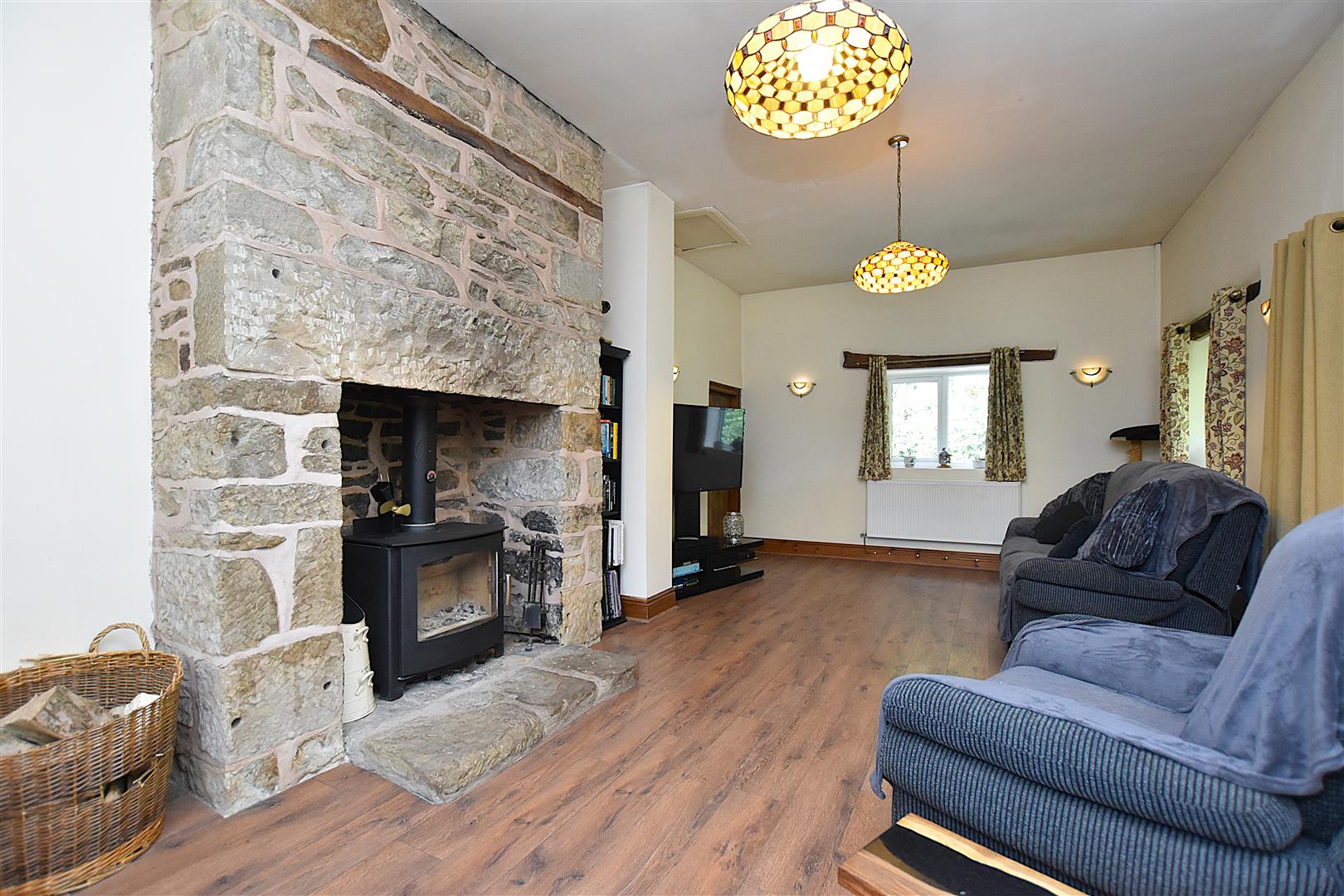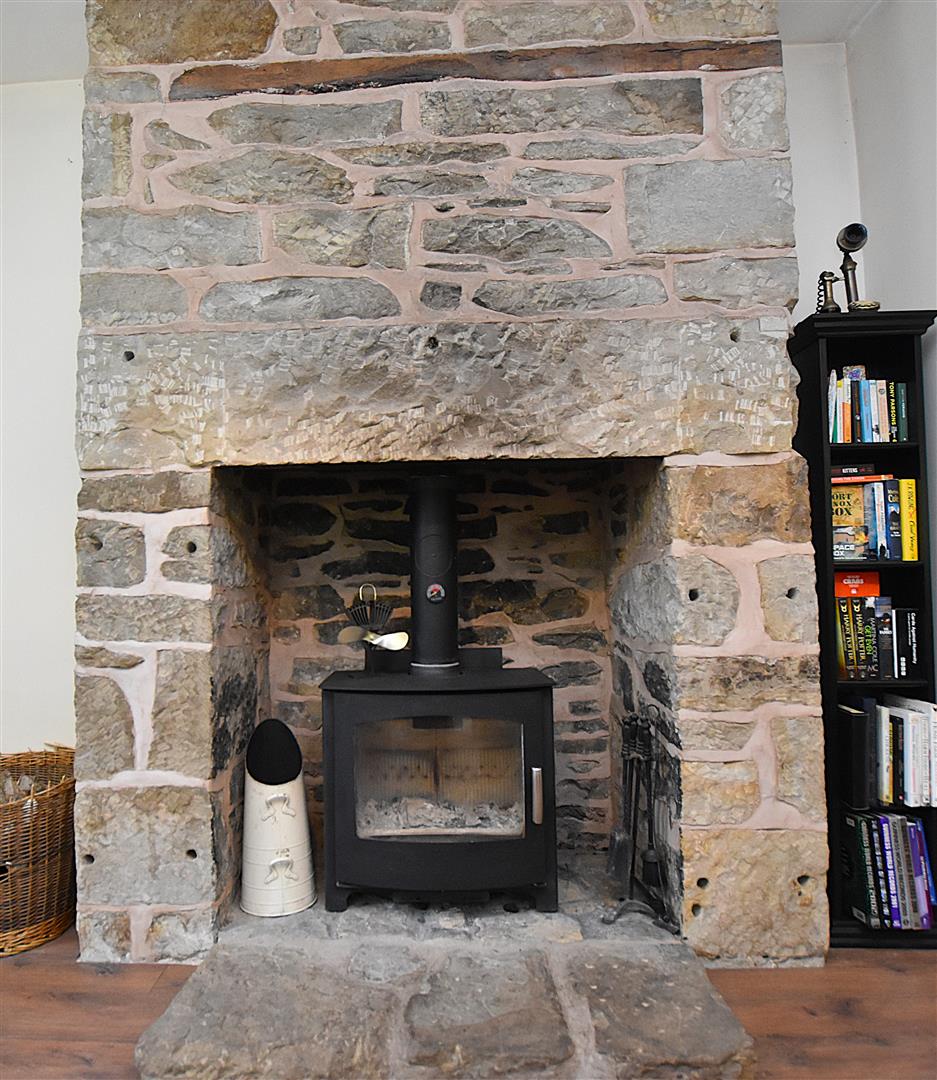 An impressive reception room with high ceilings providing a light and airy feel featuring a floor to ceiling stone chimney breast with inset log burner on a stone hearth, 4 Upvc double glazed windows, wood style flooring, 2 ceiling lights and wall light points. A cottage style timber door leads into the -