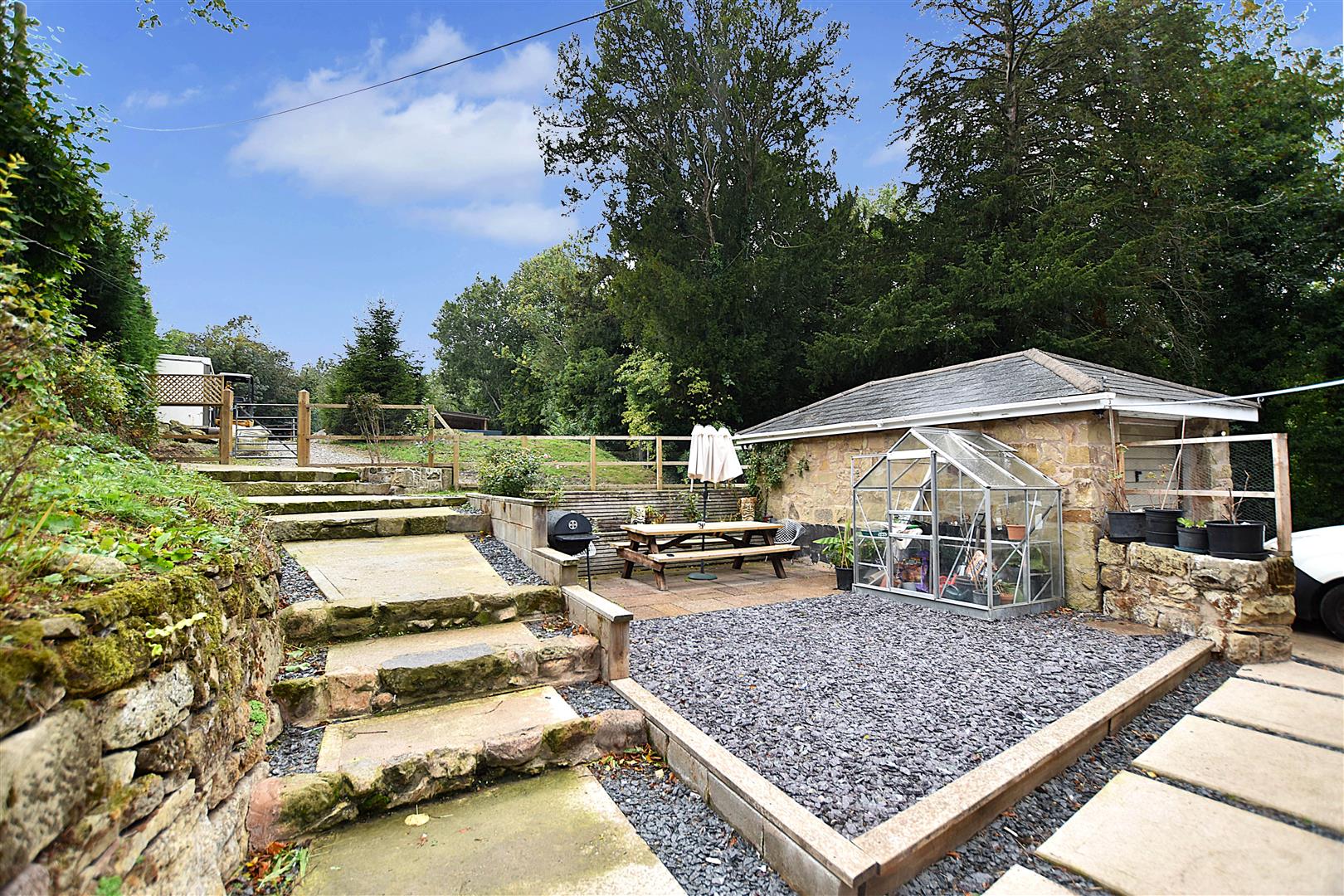 The private rear garden features a stone paved patio for outdoor entertaining, decorative slate, lawn and access gate to the large rear yard.