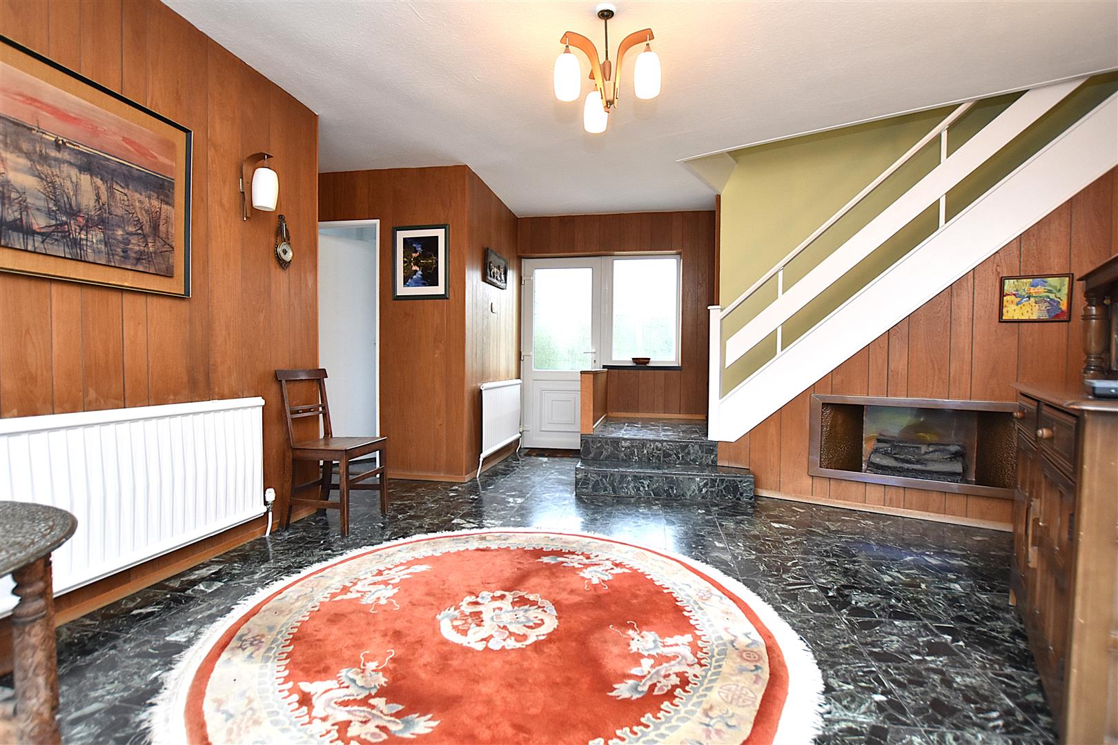 A spacious reception area with staircase rising to first floor landing with storage cupboard below, tiled flooring and two radiators.