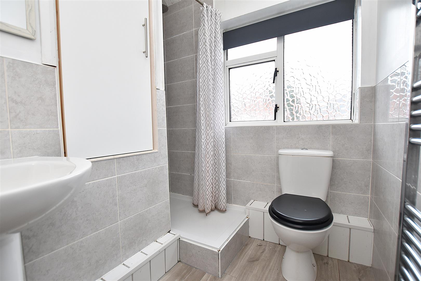 Appointed with a pedestal wash basin with mixer tap, low flush w.c, shower area with mains thermostatic shower and Drench style shower head, upvc double glazed window, chrome heated towel rail and part tiled walls.