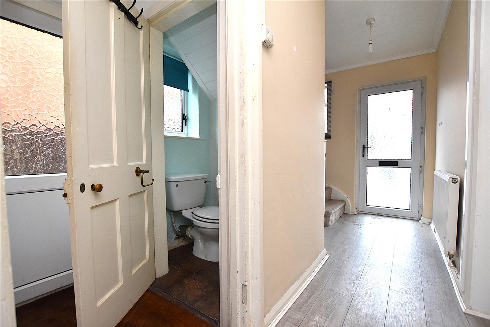 With stairs to first floor landing, upvc double glazed window, radiator and upvc part glazed external door.