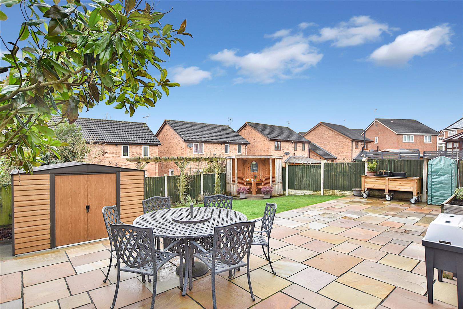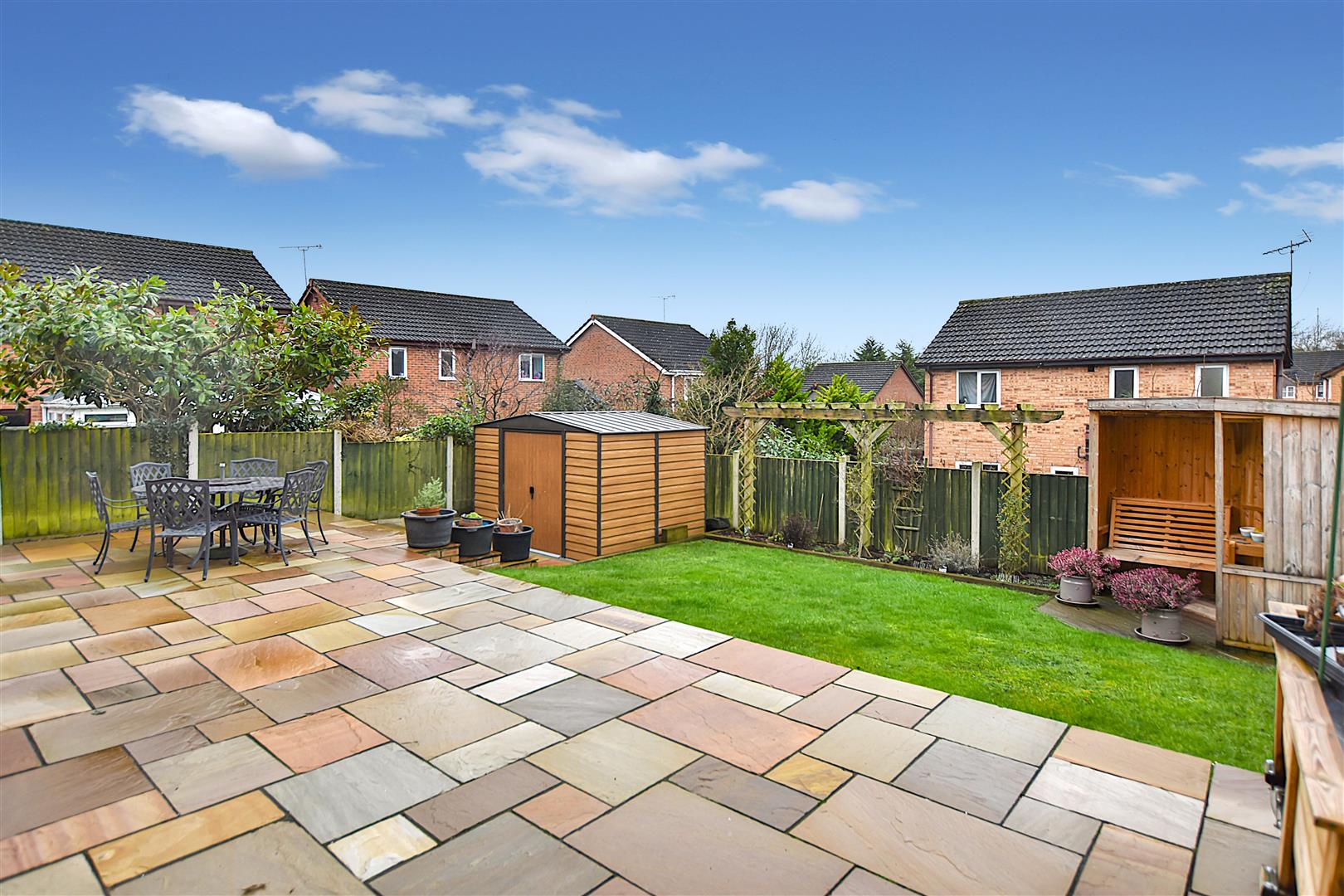 The property is approached along a private double width driveway which leads to the garage having metal up and over door, lighting and power. A front lawned garden, decorative slate border and welcome light. A gated Indian stone paved path leads alongside the house and continues into a full width matching stone paved patio with outdoor electrical socket which provides excellent outdoor entertaining space, up and down chrome wall lights, cold water tap, lawned garden, flowerbeds and side storage area.