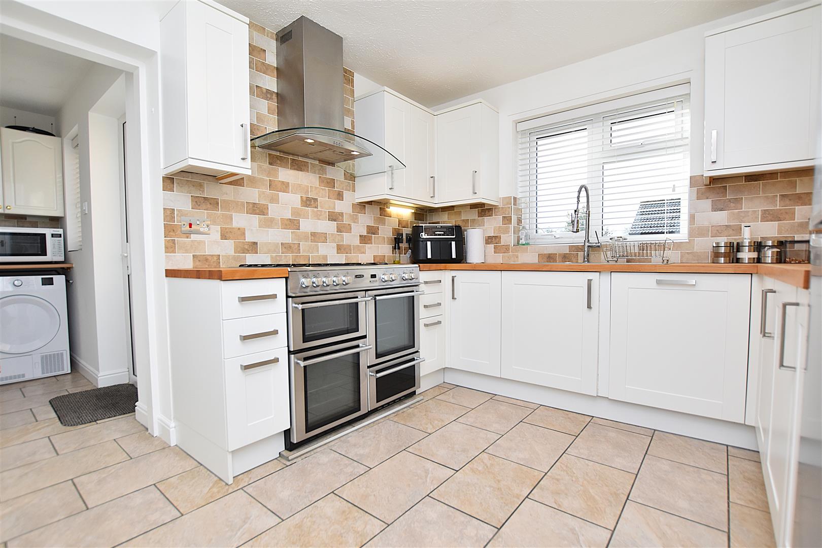 Fitted with a shaker style range of base and wall cupboards complimented by wood block work surface areas incorporating a 1 1/2 bowl stainless steel sink unit with flexi mixer tap, five burner Range cooker with stainless steel extractor hood above, integrated dishwasher, space for fridge freezer, illuminated wall cabinets, under unit lighting, part tiled walls, Travertine style ceramic tiled floor, radiator and six panel door opening to:
