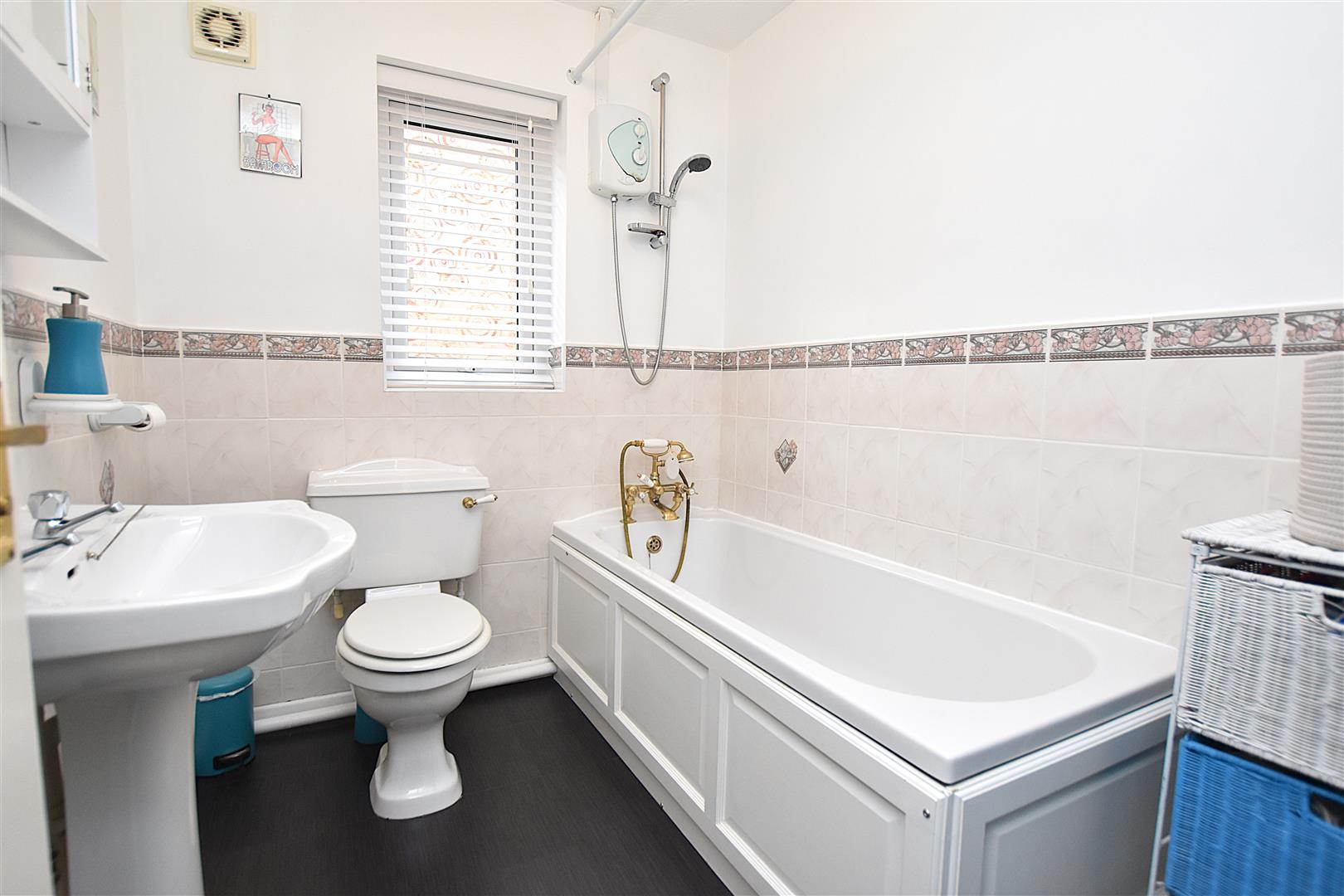 Appointed with a white suite of pedestal wash basin, low flush w.c, bath with mixer tap and electric shower over, part tiled walls, shaver socket, extractor fan, upvc double glazed window, vinyl style flooring and radiator.