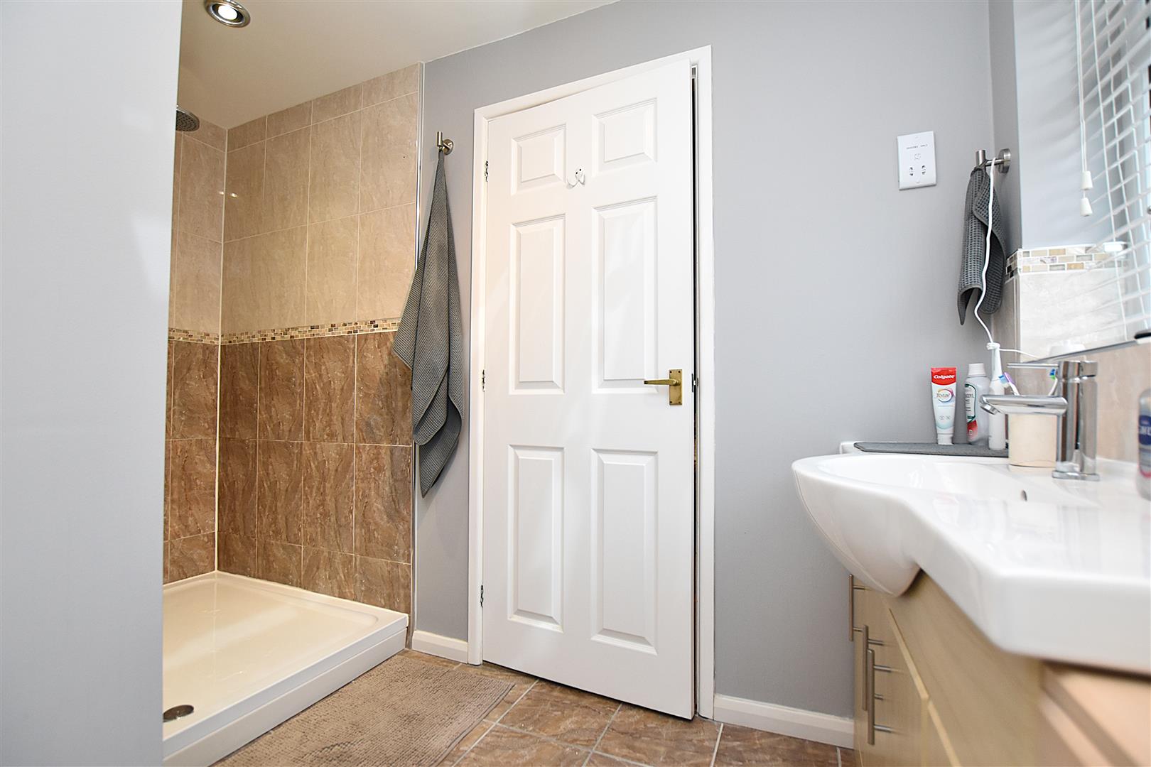 Appointed with a good sized shower area with mains thermostatic shower and Drench style shower head, radiator, double sided sink unit with mixer tap set within vanity unit also incorporating w.c, part tiled walls, tiled flooring, shaver socket and extractor fan.