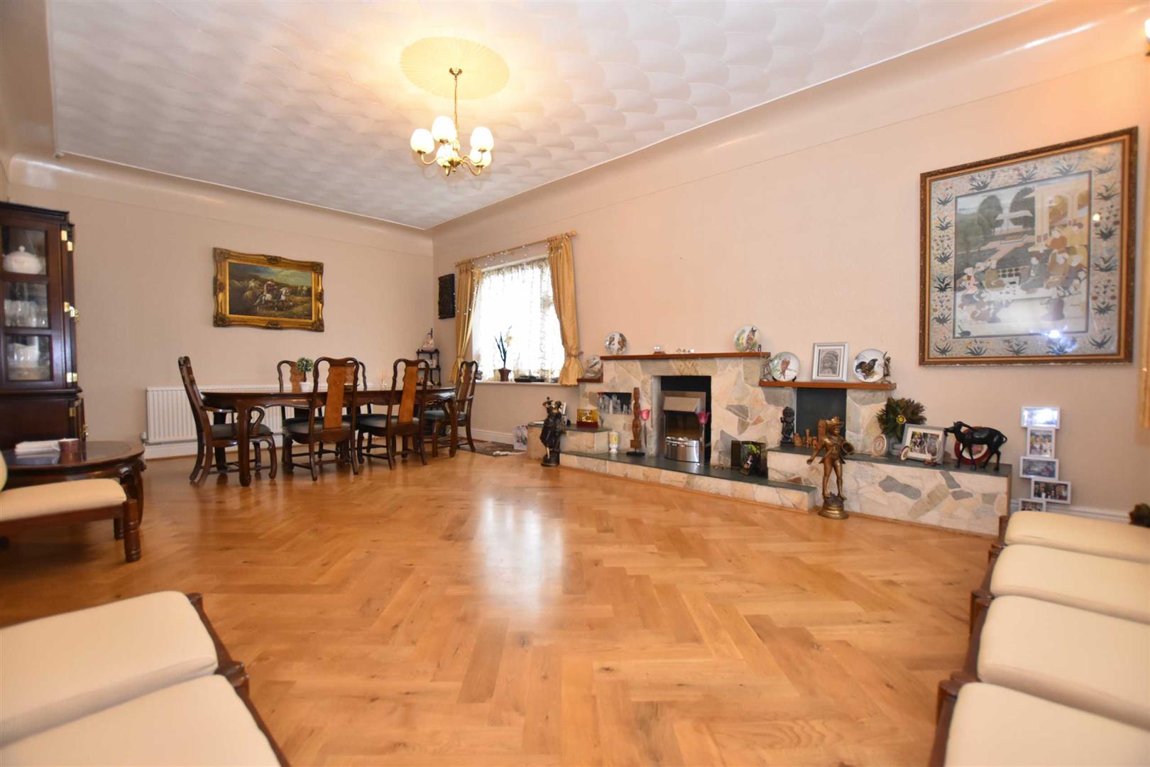 An excellent reception room featuring an attractive Herringbone patterned oak floor, fireplace with side plinths, upvc double glazed window overlooking the front garden and upvc double glazed window to side, deep coving to ceiling and two radiators.