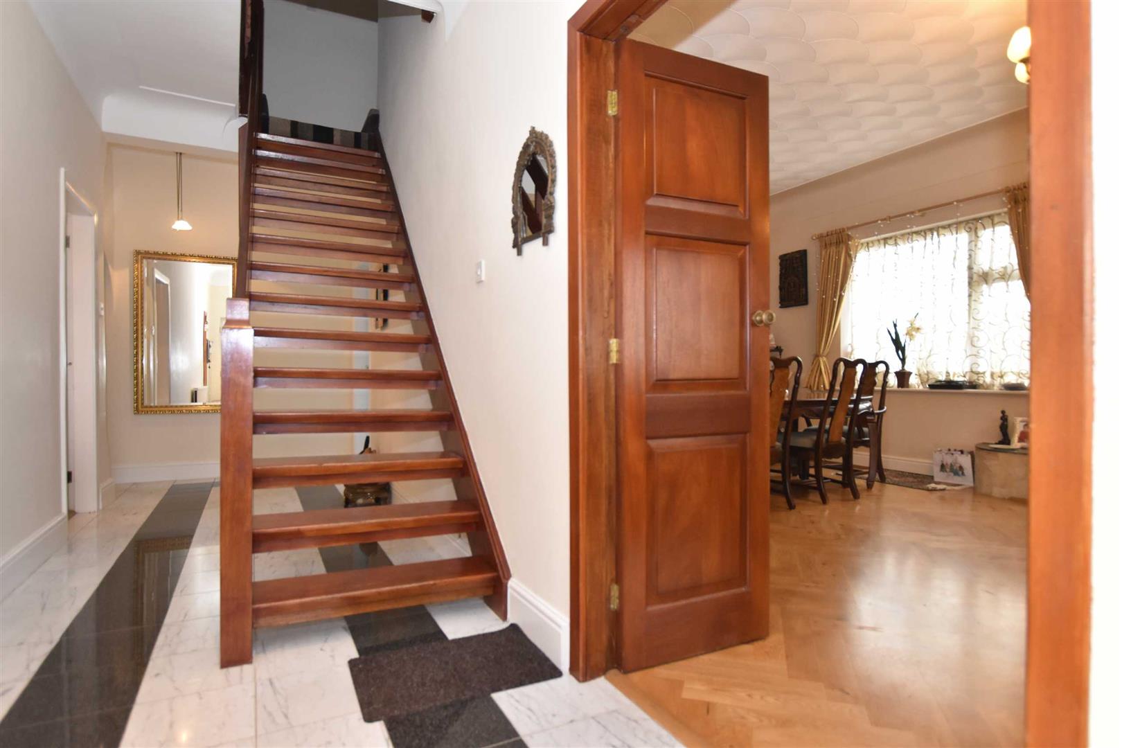 Featuring an attractive tiled floor, central staircase rising to the first floor landing, radiator, deep coving to ceiling, upvc tall side window, feature arch and double doors opening to the: