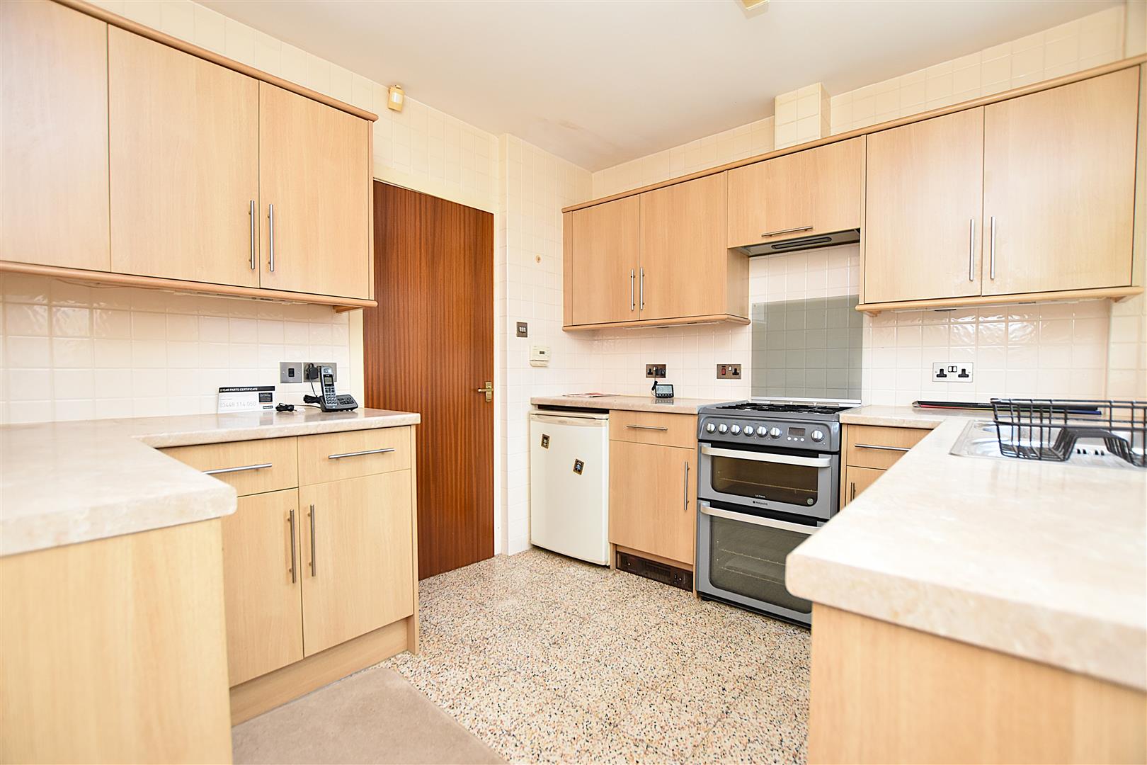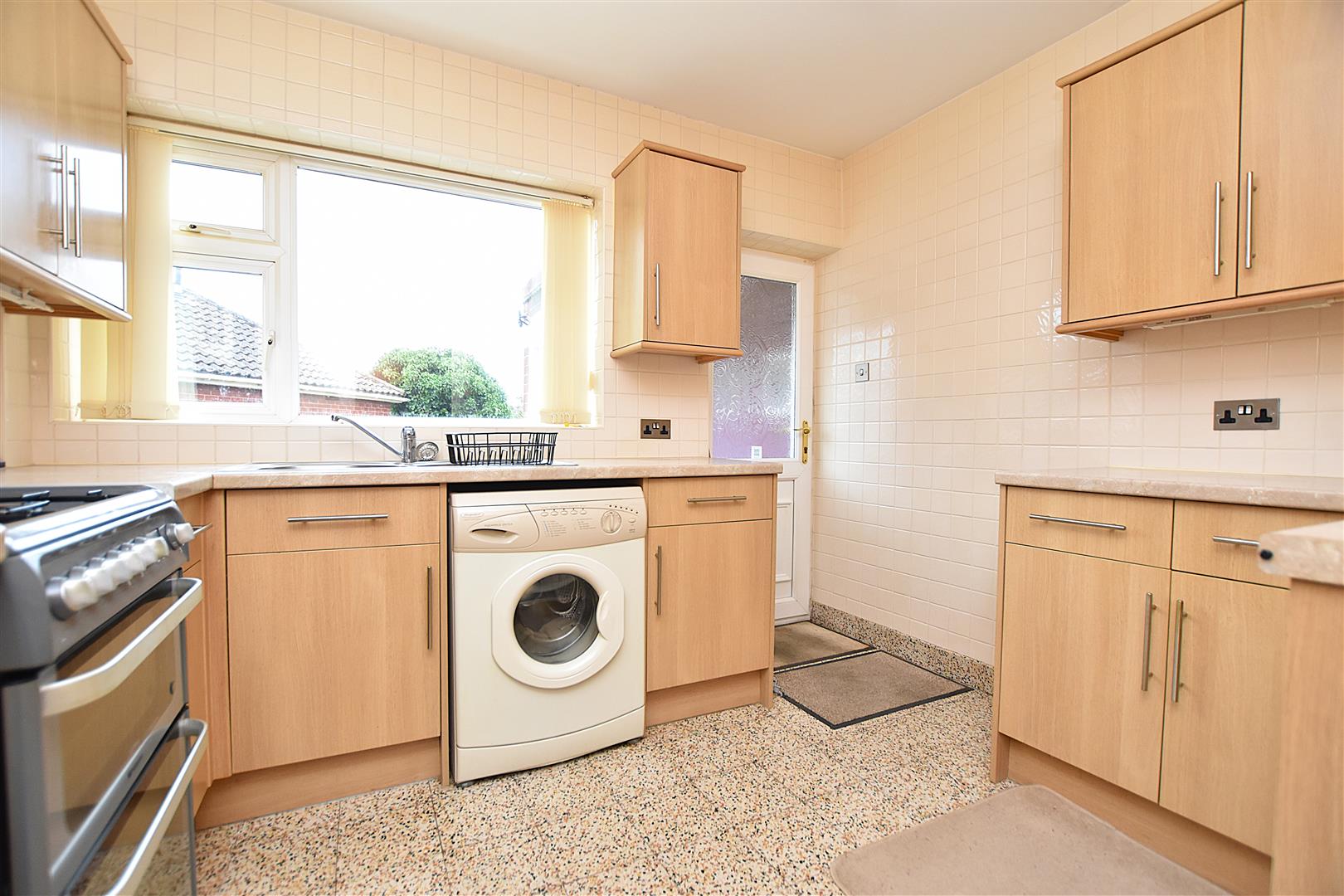 Fitted with a range of base and wall units with work surface areas incorporating a stainless-steel single drainer sink unit with mixer tap and upvc double glazed window above, fully tiled walls, gas cooker point, plumbing for washing machine, space for under counter fridge and upvc part glazed external door.