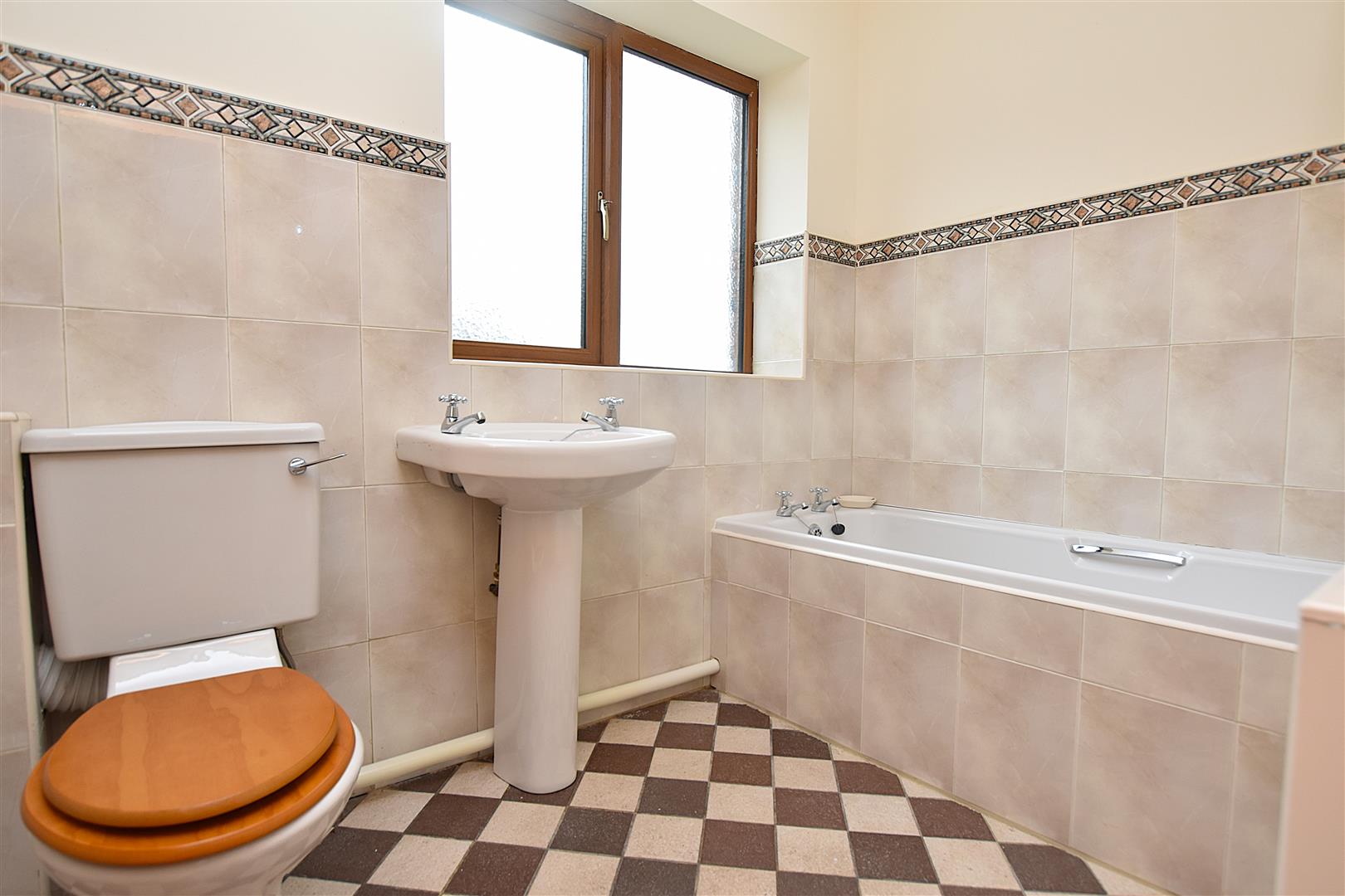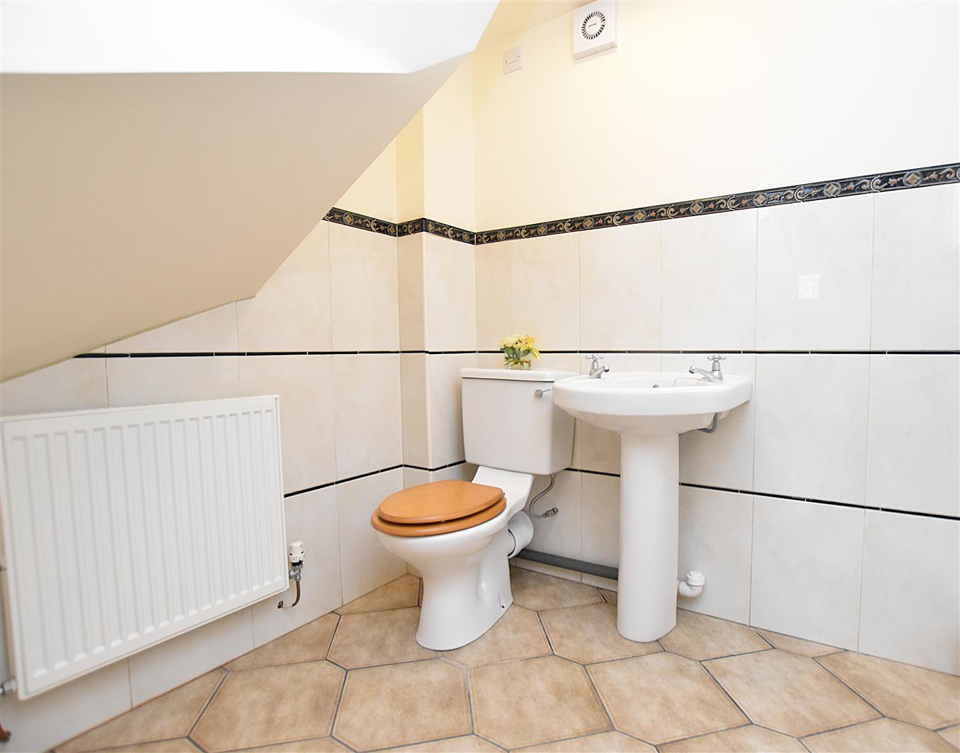 Appointed with a pedestal wash basin, low flush w.c, radiator, part tiled walls, tiled flooring and extractor fan.