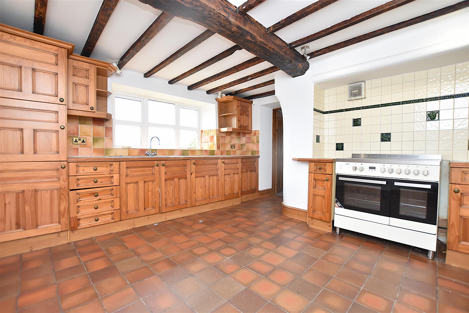 Fitted with a range of base and wall cupboards complimented by work surface areas incorporating a 1 1/2 bowl stainless steel single drainer sink unit with mixer tap and upvc double glazed window above with far reaching views, part tiled walls, radiator, tiled flooring, Range style cooker, beams to ceiling and wall light points.