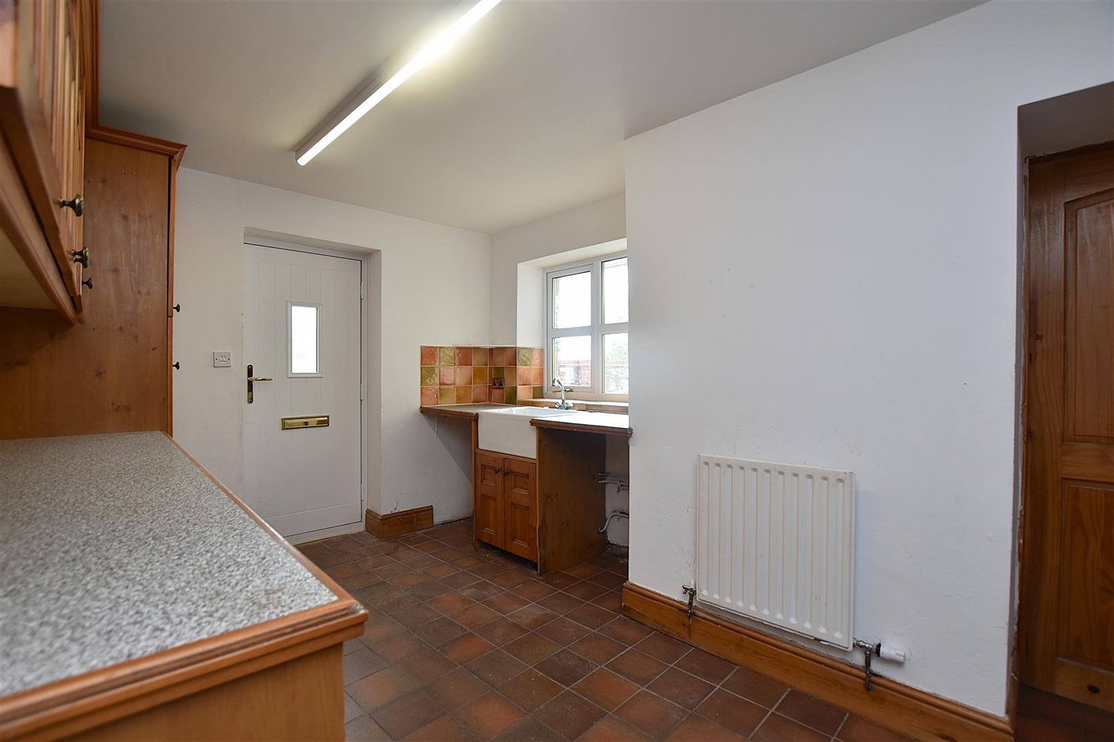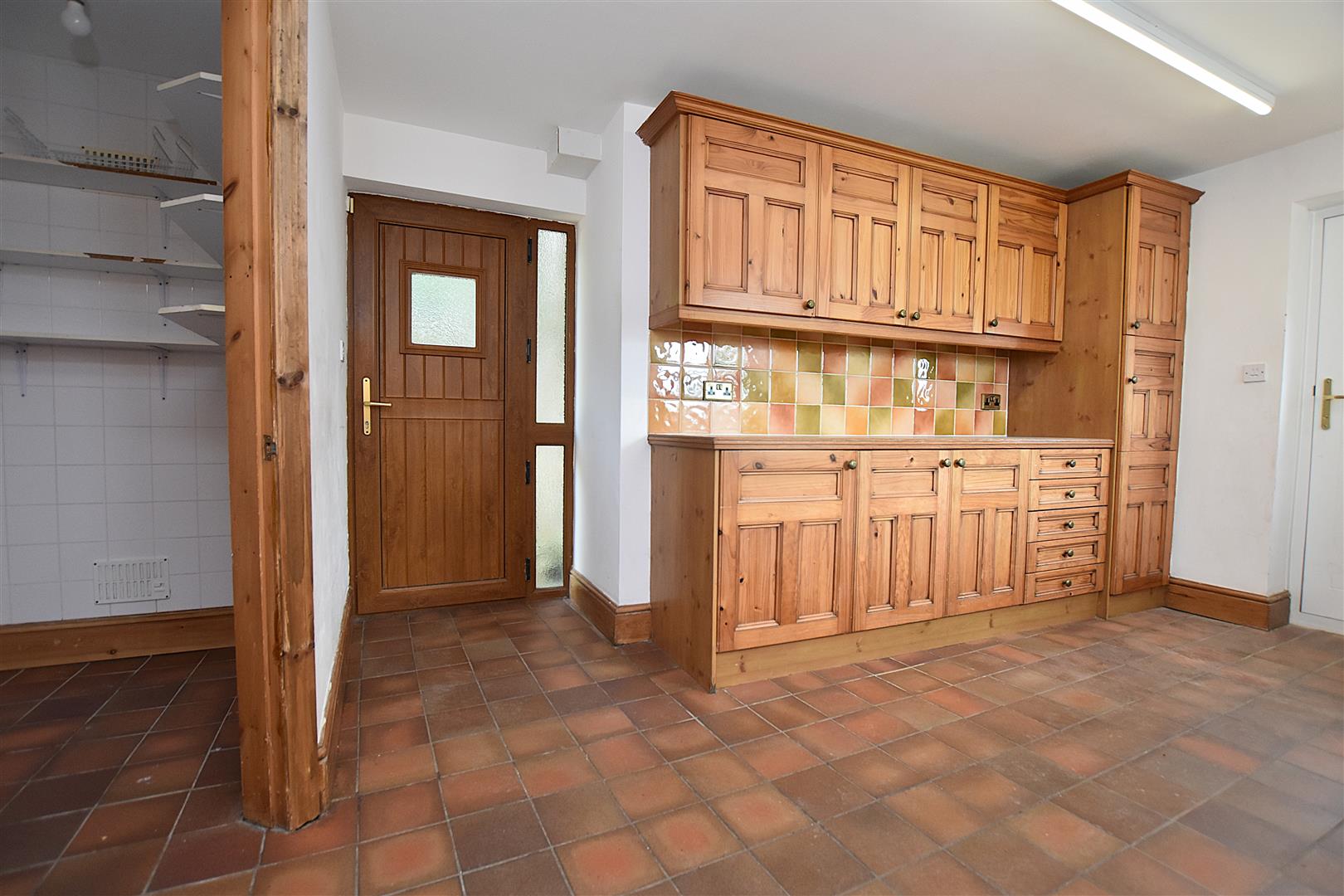 Fitted with a range of base and wall units with tiled worktops incorporating a Belfast style sink with upvc double glazed window above, radiator, upvc part glazed external door, plumbing for washing machine, space for tumble dryer, part glazed composite door, walk-in larder cupboard with tiled floor, tiled walls and shelving.