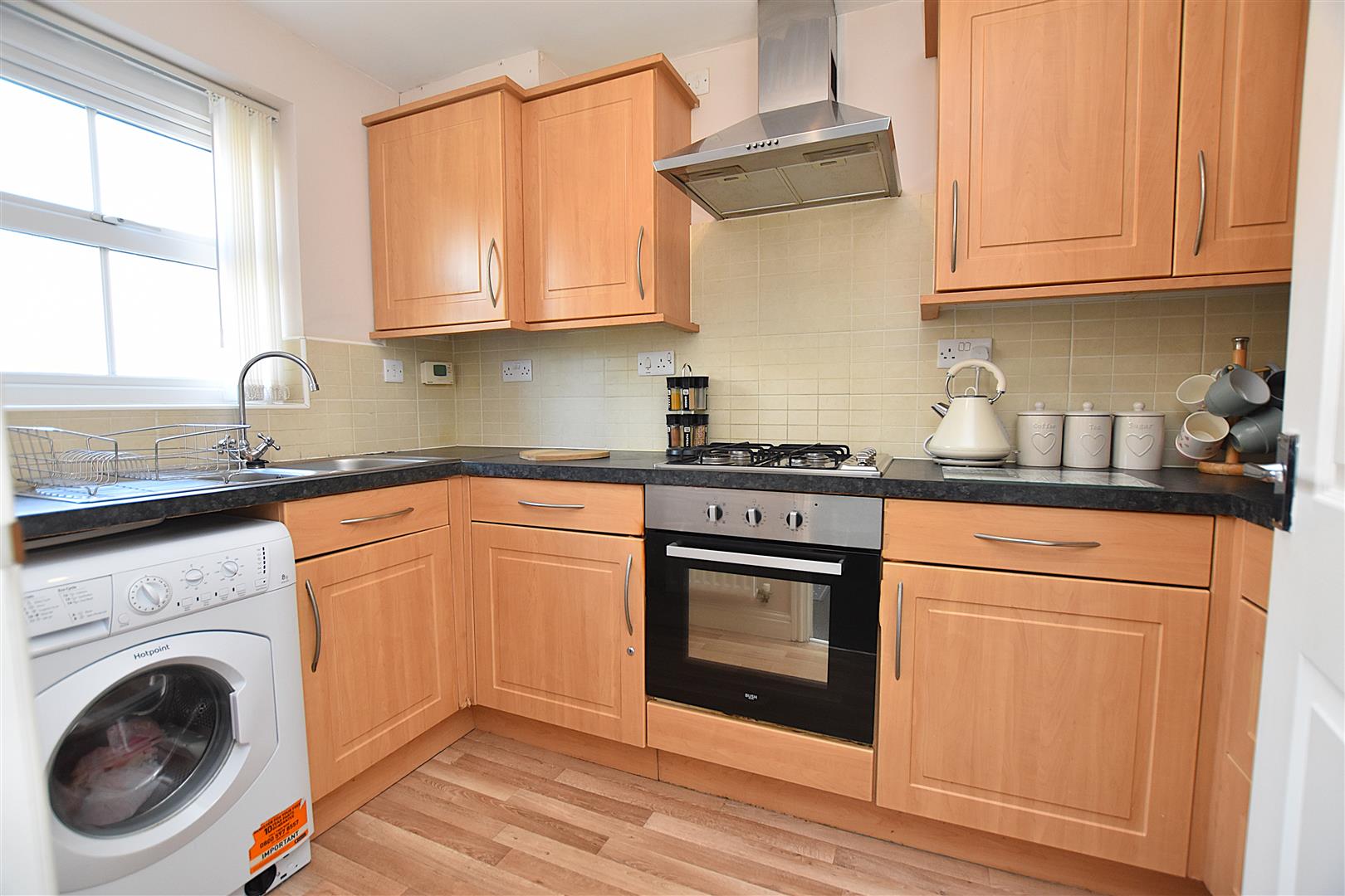 Fitted with a range of base and wall units complimented by work surface areas incorporating a stainless steel 1 1/2 bowl sink unit with mixer tap and upvc double glazed window above, four ring gas hob with oven/grill below and stainless steel extractor hood above, part tiled walls, plumbing for washing machine, space for fridge freezer and radiator.