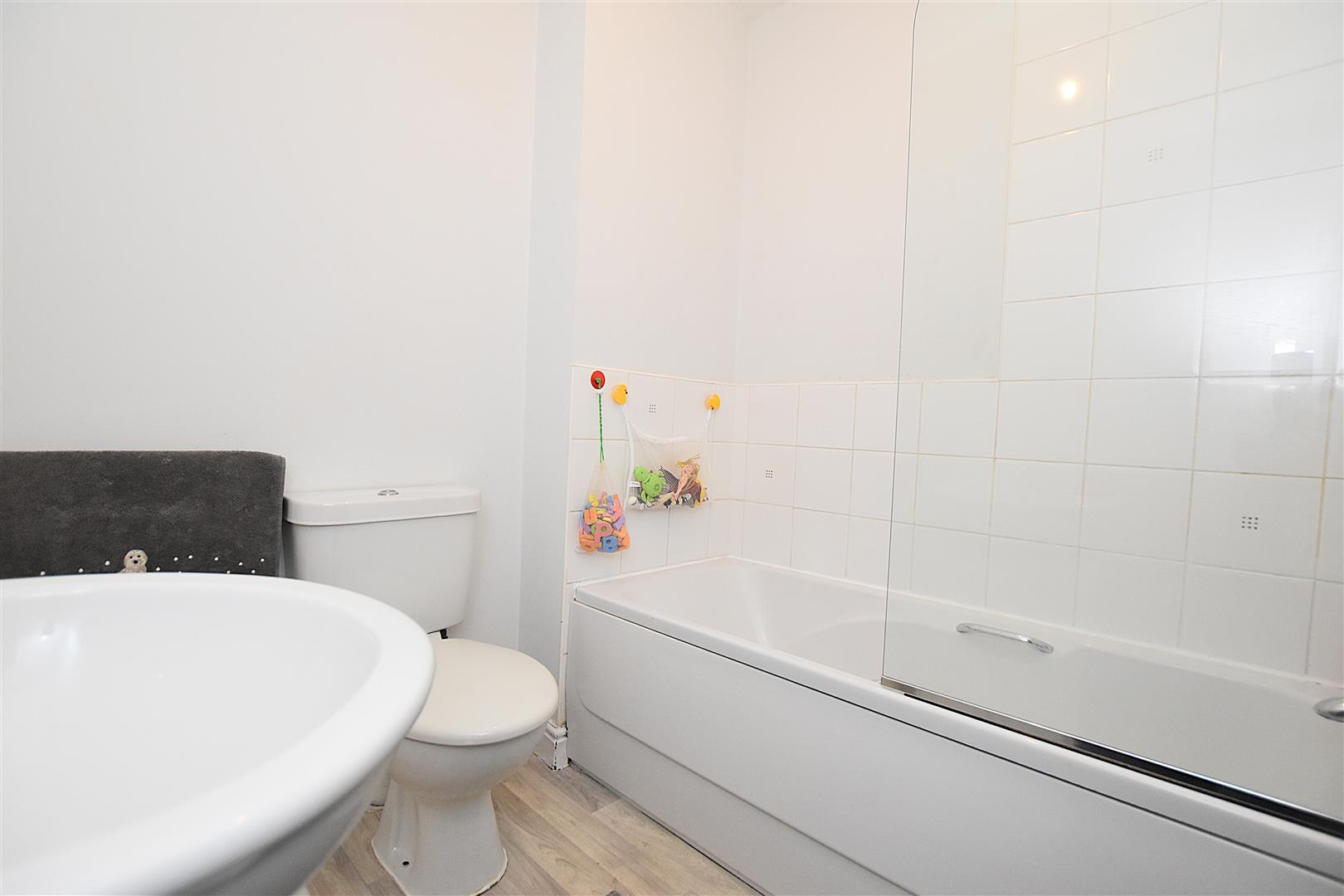 Appointed with a low flush w.c, pedestal wash basin with mixer tap, bath with mains thermostatic shower over and splash screen, part tiled walls, extractor fan, radiator and shaver socket.