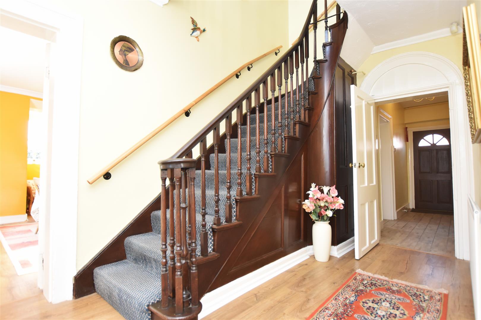 Featuring a beautiful turned staircase, wood effect flooring, radiator and original four panel doors off.