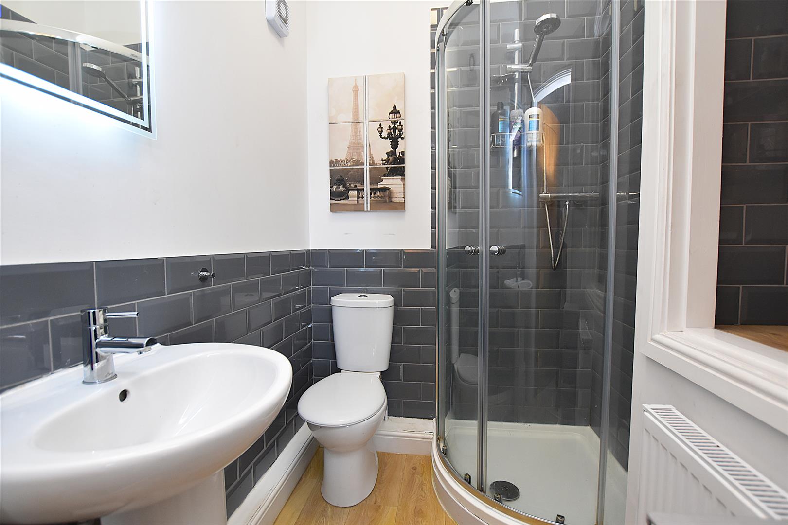 Appointed with a corner shower cubicle with mains thermostatic shower, pedestal wash basin with illuminated mirror above, low flush w.c, radiator, extractor fan, wood effect flooring, recess shelf and part tiled walls.