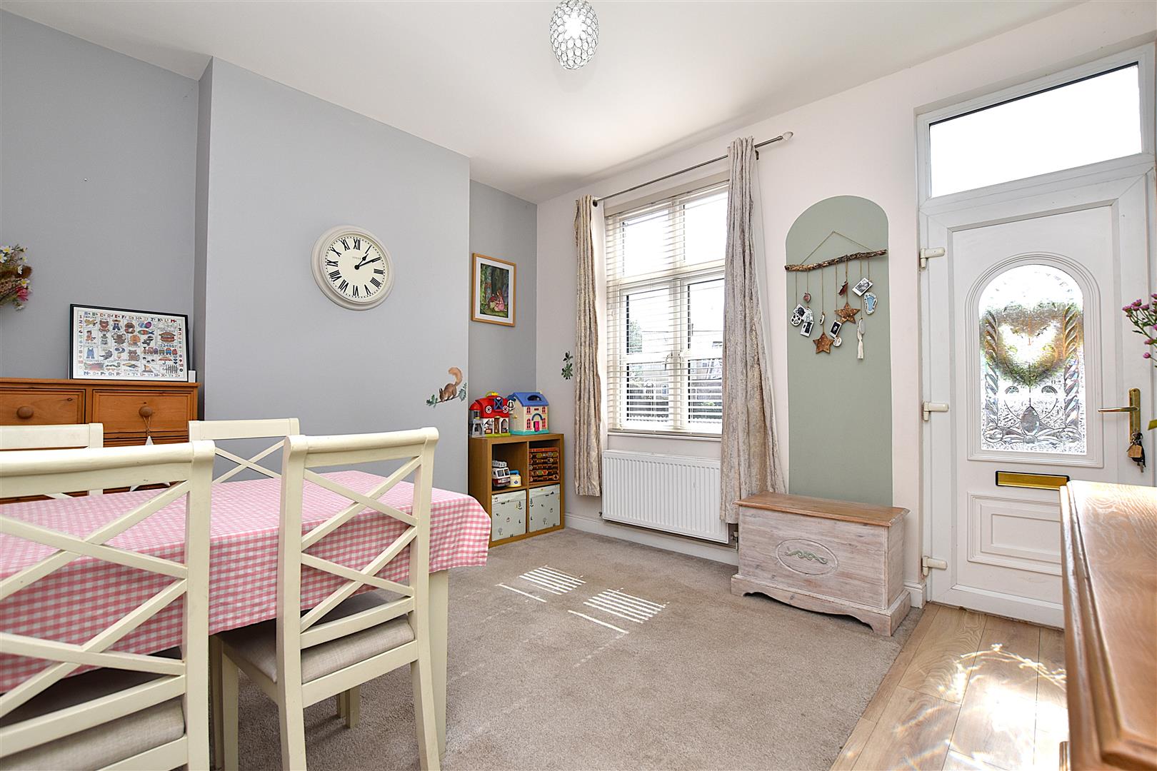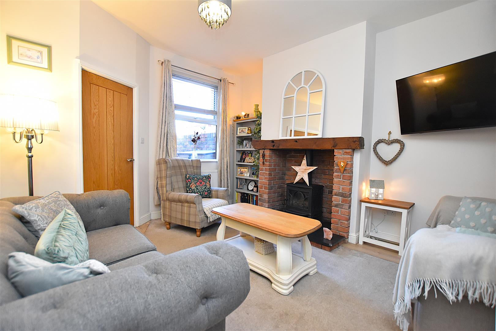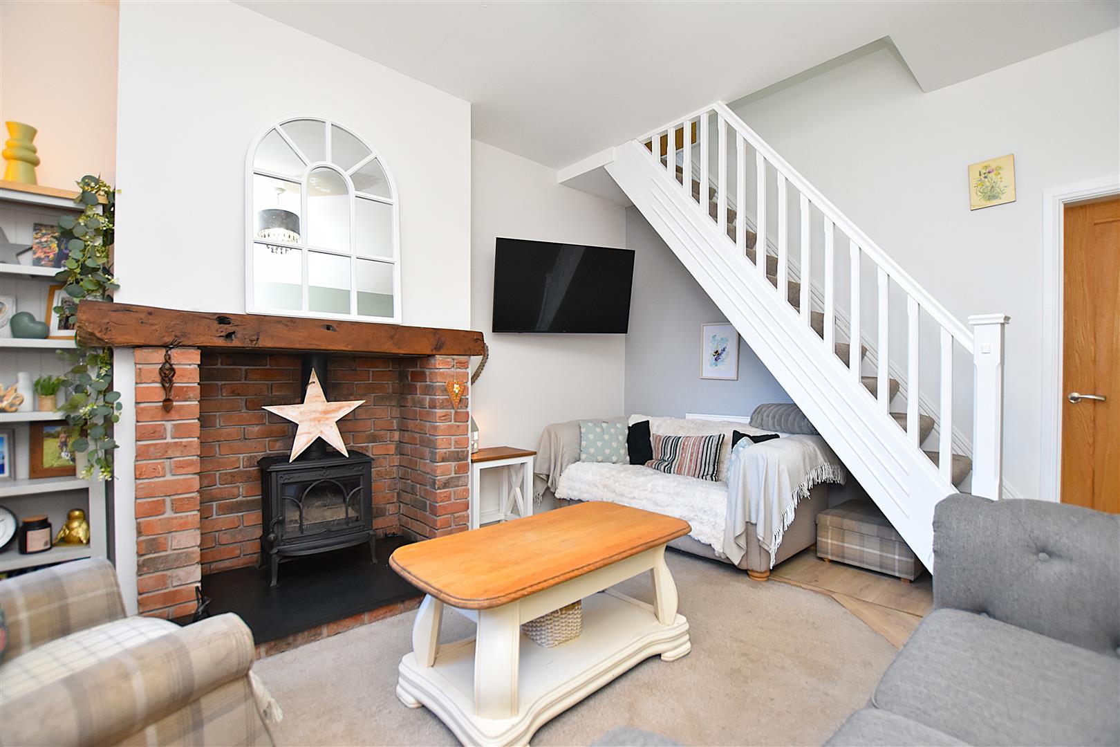 Featuring exposed brick to chimney breast with inset log burner on a slate hearth, part wood effect flooring, part carpet, stairs to first floor landing, upvc double glazed window to rear, radiator and oak veneer door opening to: