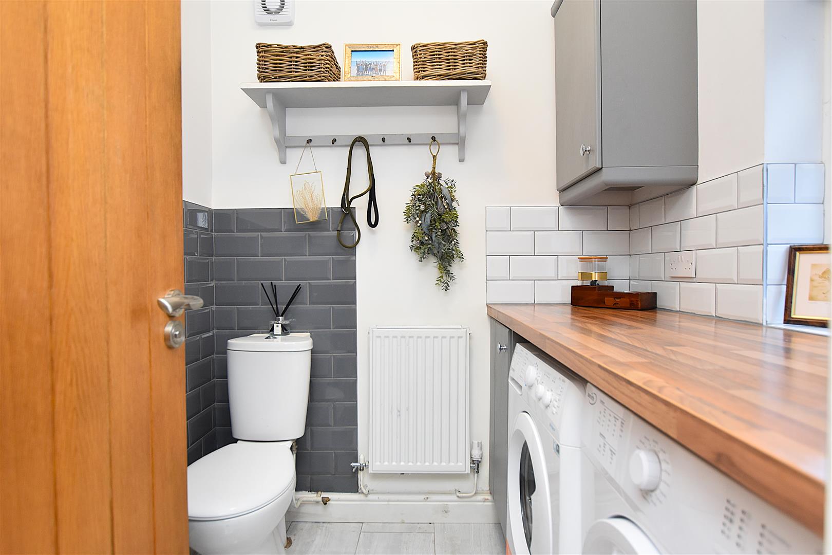 Oak veneer door, wood effect work surface areas with space for dryer and plumbing for washing machine below, low flush w.c, wash basin, radiator, part tiled walls and upvc double glazed window.
