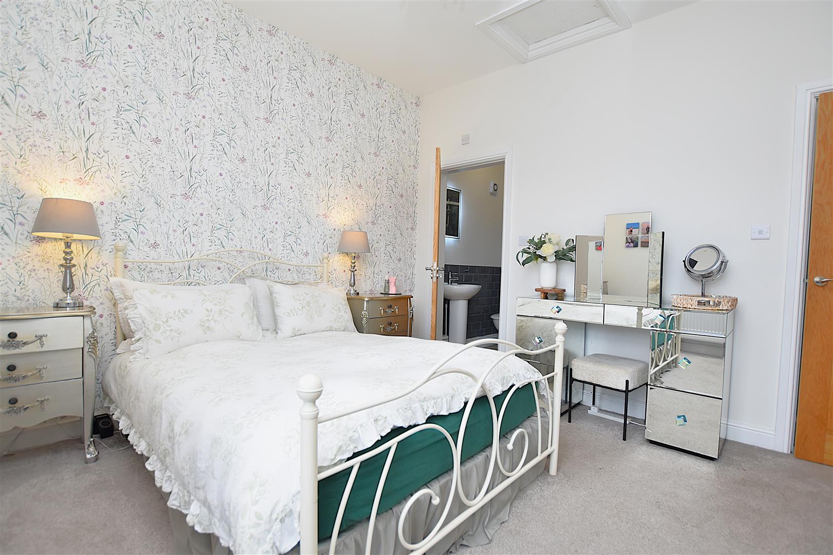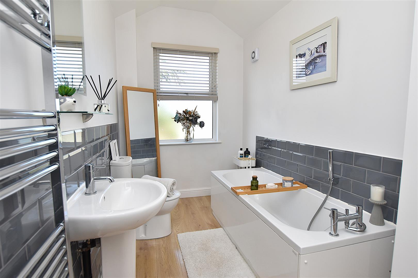 Appointed with a white suite of pedestal wash basin with illuminated mirror above, low flush w.c, bath with chrome mixer tap and hand held shower take-off, part tiled walls, chrome heated towel rail, upvc double glazed window, extractor fan, wood effect flooring and storage cupboard housing the gas combination boiler.