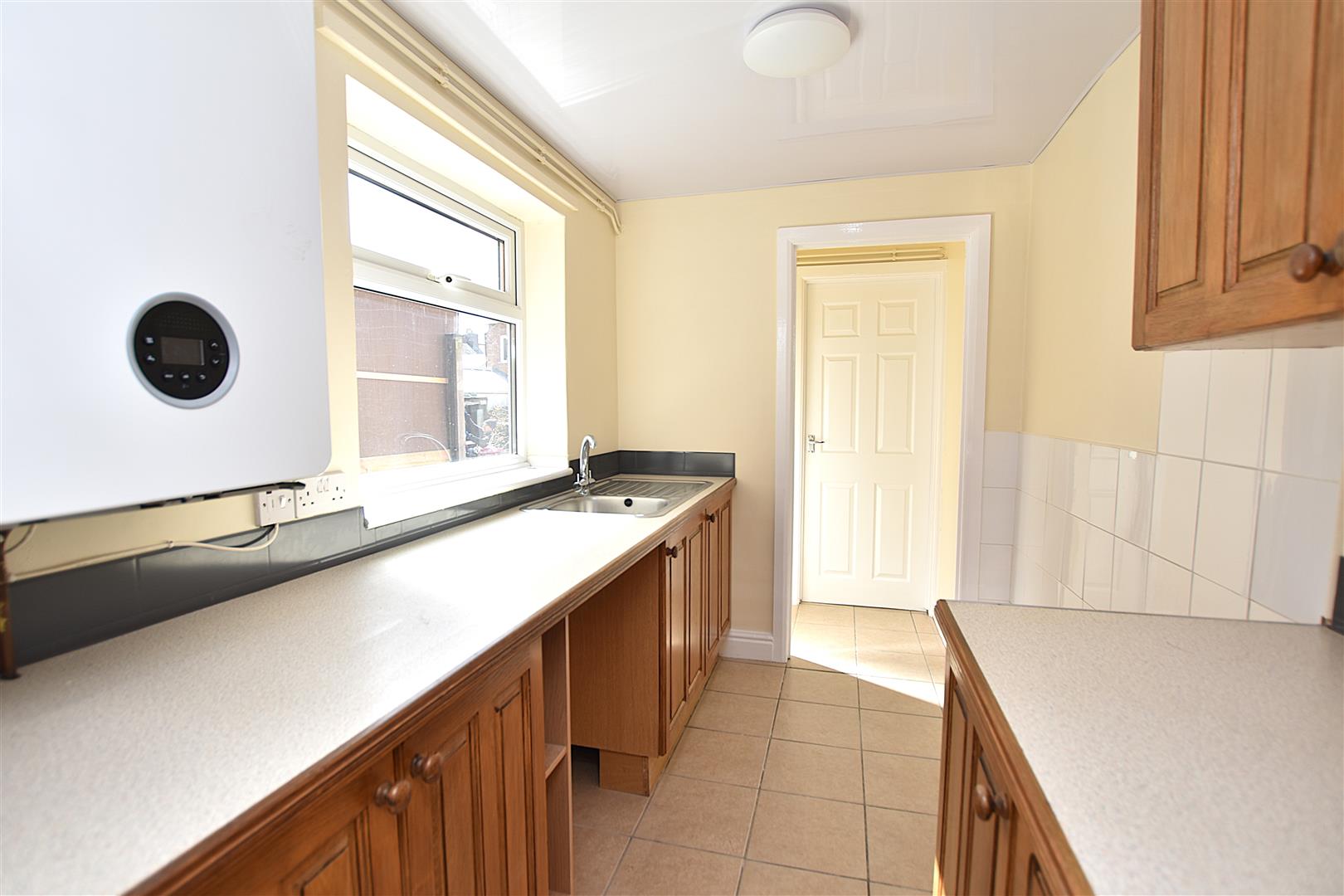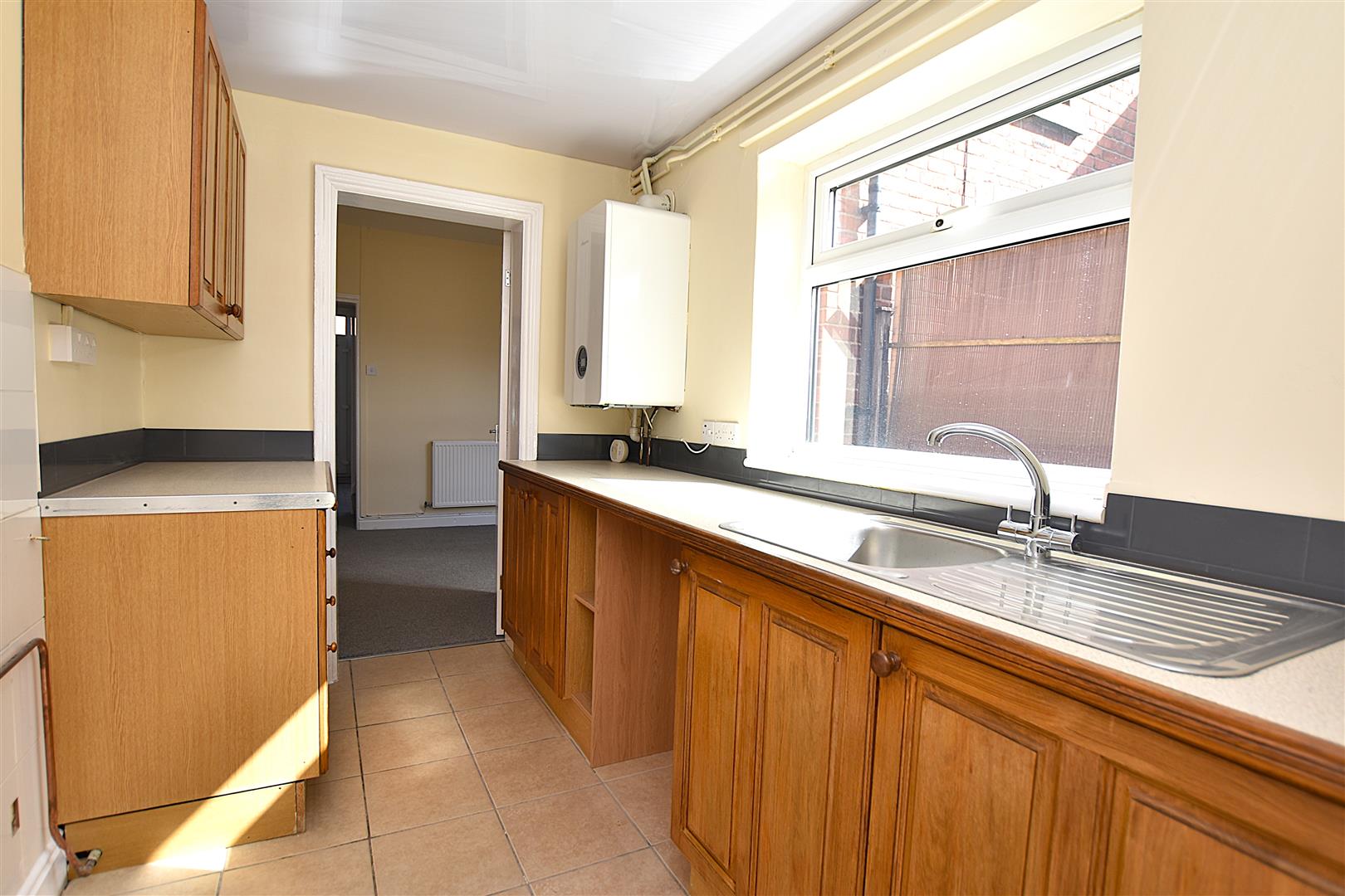 Fitted with a range of base and wall cupboards with work surface areas incorporating a stainless steel single drainer sink unit with mixer tap and upvc double glazed window above, plumbing for washing machine, gas cooker point, part tiled walls, modern Worcester gas combination boiler and tiled flooring that continues into: