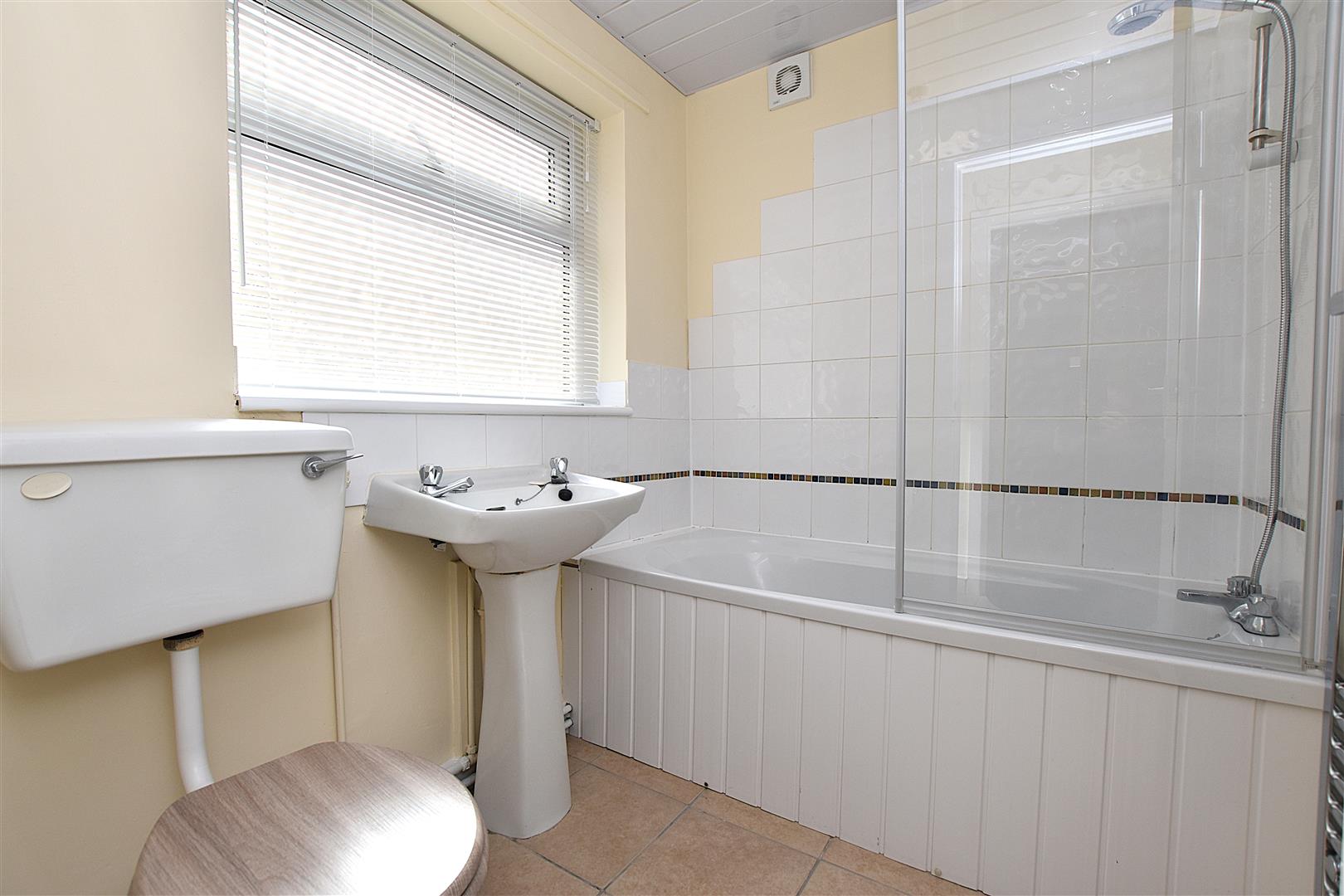 Appointed with a white suite of low flush w.c, pedestal wash basin, bath with mixer tap, shower take-off and splash screen, part tiled walls, upvc double glazed window with fitted blind, chrome heated towel rail, extractor fan and tiled flooring.