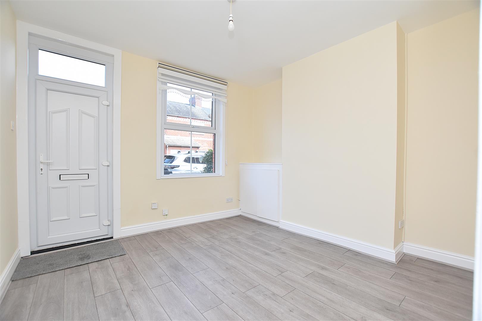 Upvc double glazed window to front with fitted blind, storage cupboard within recess, newly fitted grey wood effect laminate flooring, radiator and six panel door opening to: