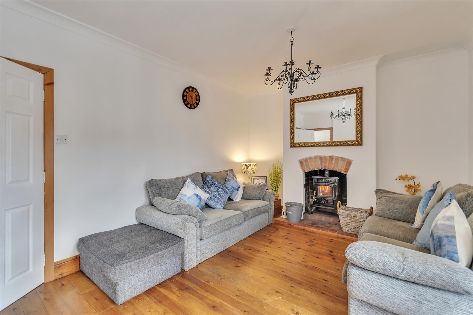 A cosy and inviting room featuring a characterful exposed brick chimney breast, housing a multi-fuel burner. A window to the side allows for natural light, while a useful understairs storage area adds practicality. The room is finished with wooden flooring and a radiator, creating a comfortable and welcoming space.