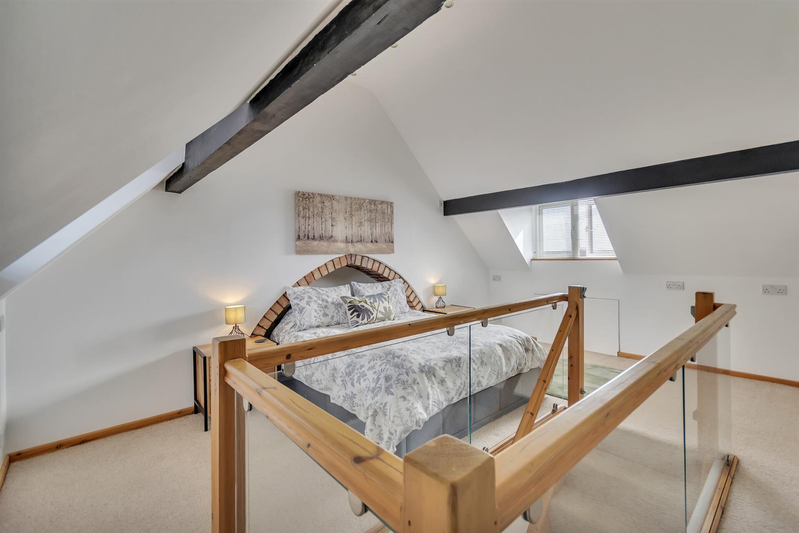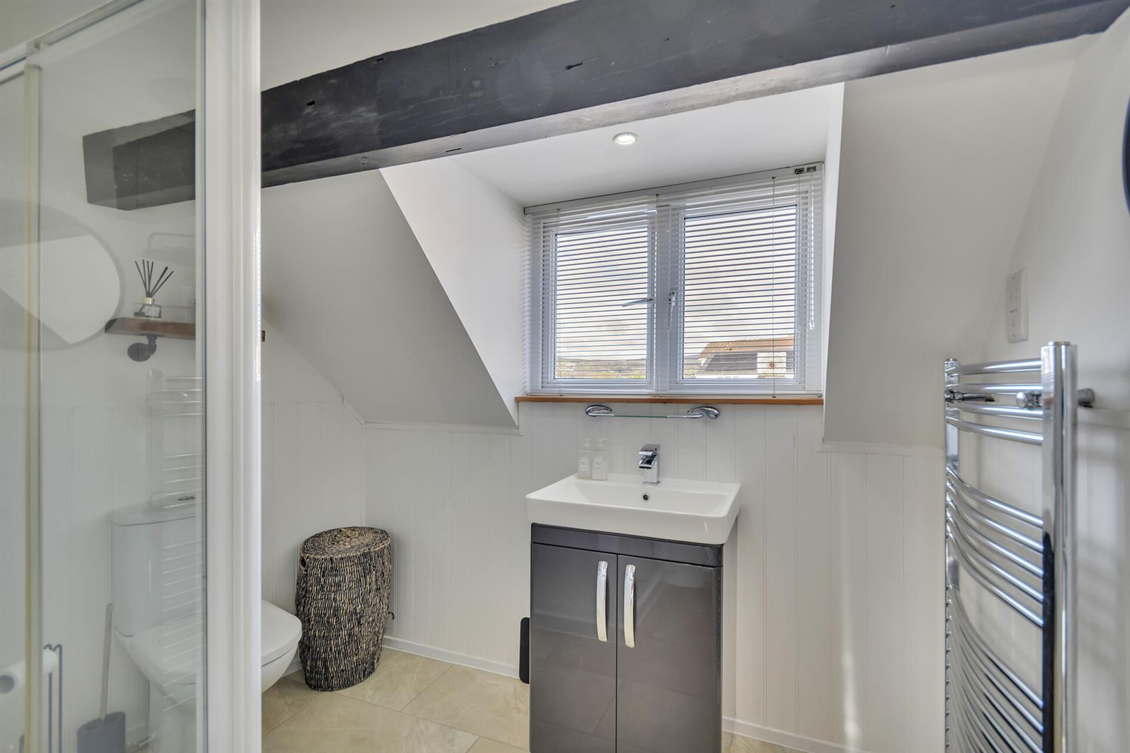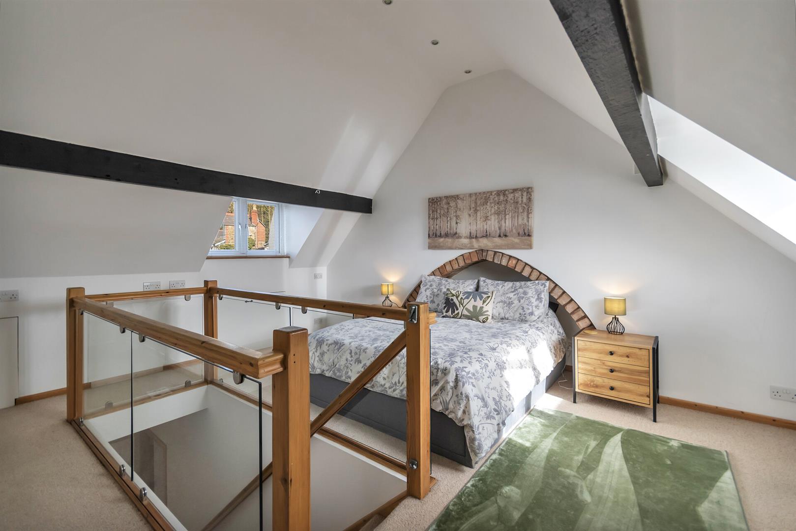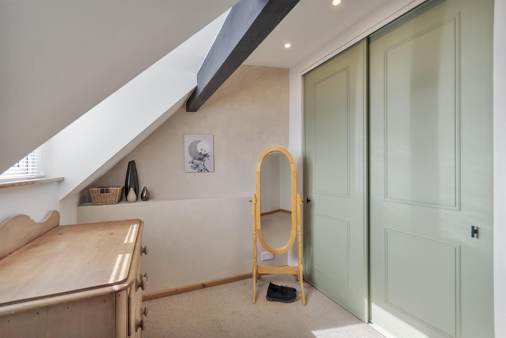 Occupying the entire second floor is an impressive and spacious master suite, enhanced by dual-aspect windows that flood the room with natural light. Character features include an exposed brick chimney breast and attractive beams to the ceiling, adding warmth and charm. The suite benefits from a generous dressing room with fitted wardrobes, a window, and further ceiling beams, leading through to a well-appointed en-suite. The en-suite comprises a shower enclosure, wash hand basin set within a vanity unit, W.C., window, and a heated towel rail.