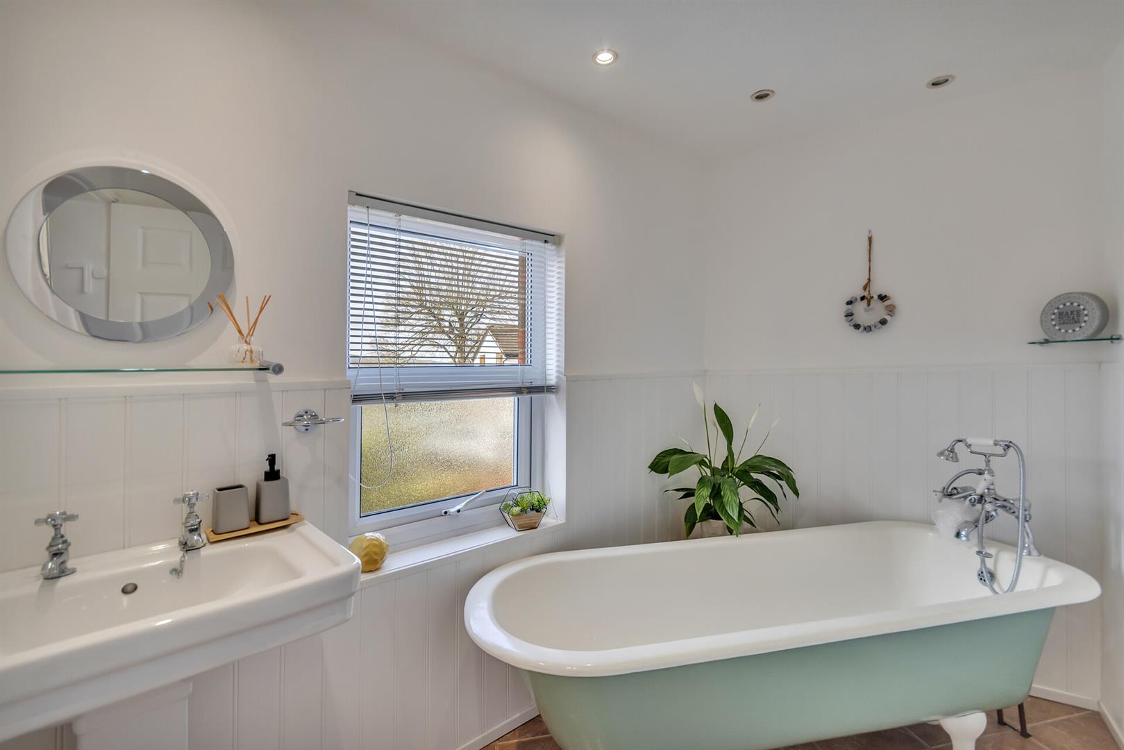 Free standing bath with shower take off, wash hand basin, window, radiator.